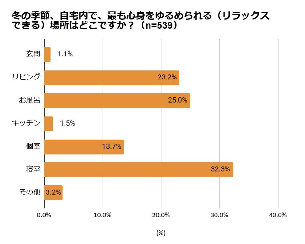 冬に自宅でリラックスできる場所は、1位「寝室」、2位「お風呂」。