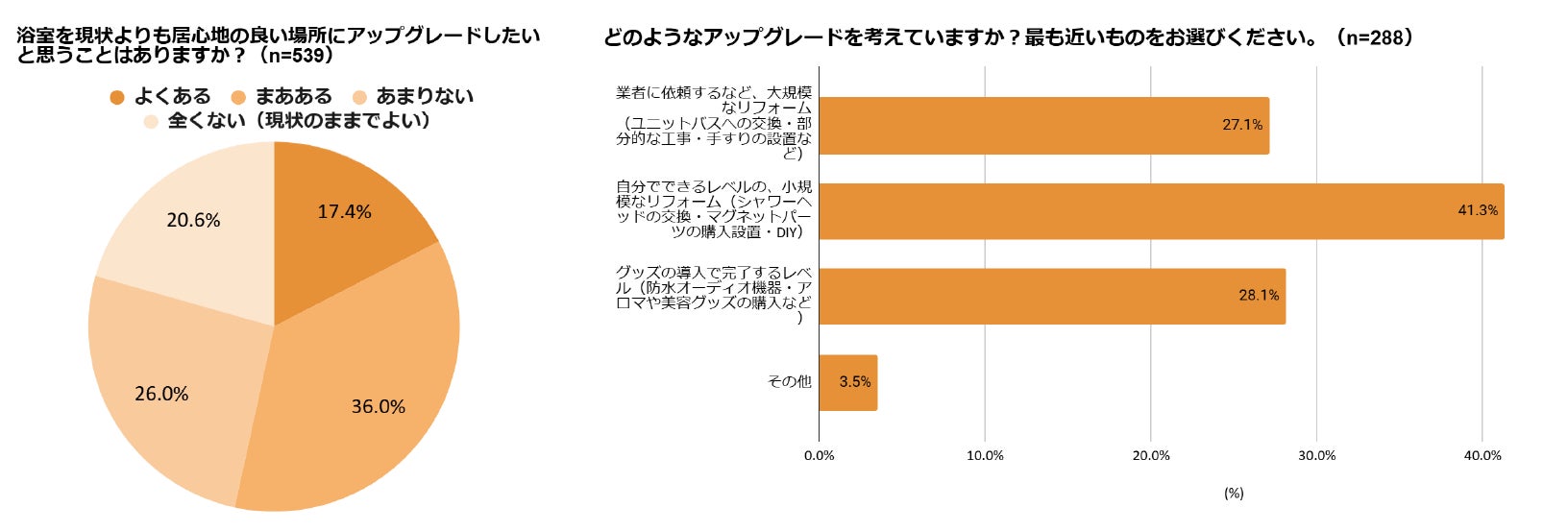 また、アップグレードの規模について聞いたところ、「自分でできるレベルの小規模なリフォーム」(41.3%)が一番多く、次いで「グッズの導入で完了するレベル」(28.1%)、「業者に依頼するなど大規模なリフォーム」(27.1%)となりました。アロマや美容グッズなど簡易的なものではなく、シャワーヘッドの交換・マグネットパーツの設置・DIYなど少し手間やお金をかけて「自分でできるレベルの小規模なリフォーム」を行い、バスタイムをより楽しみたいと意欲的に考えている人が一定数いることが分かりました。