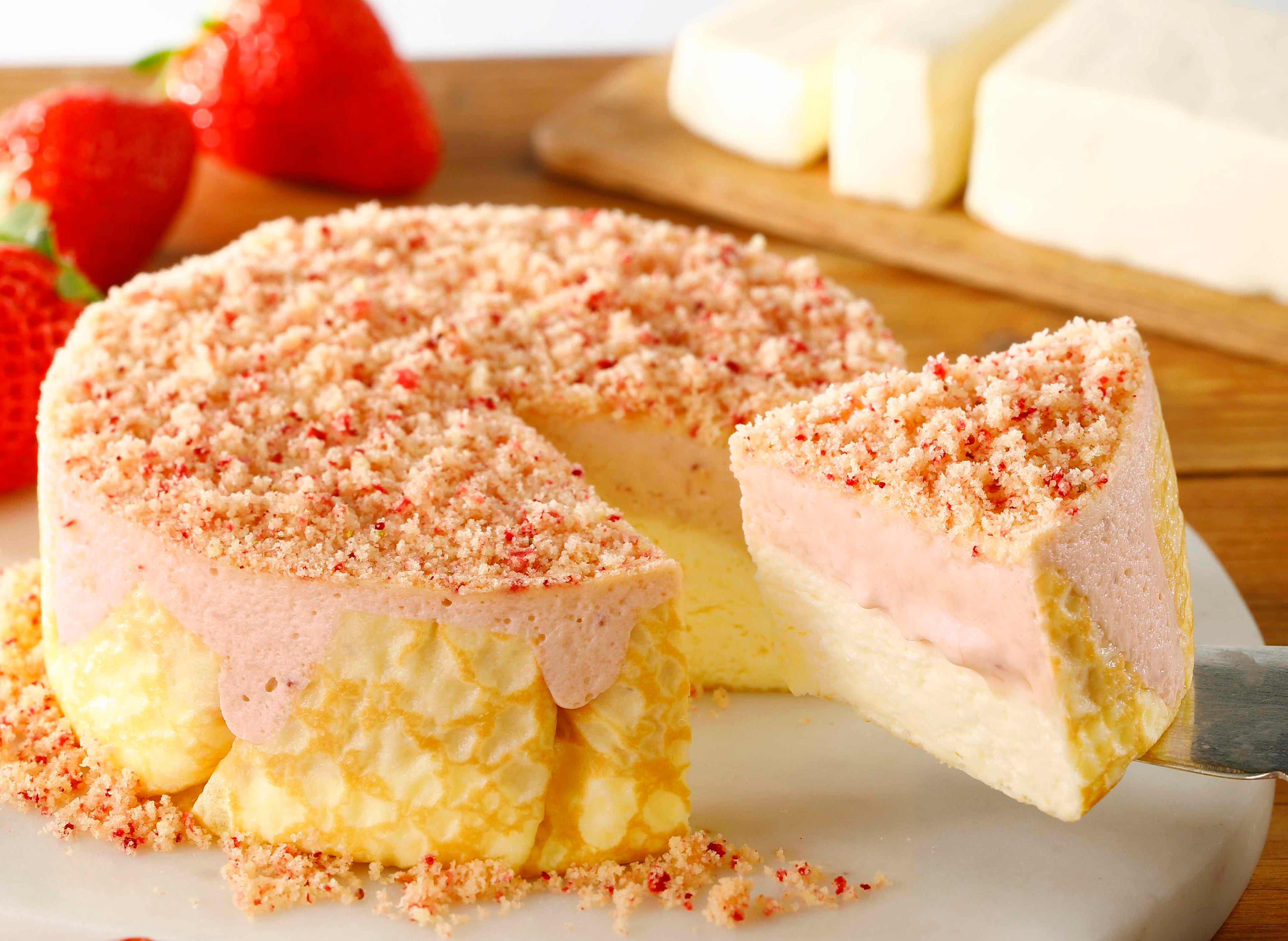 栃木県産スカイベリーのピューレ、北海道産マスカルポーネとクリームチーズで仕立てた“苺のフロマージュ”と北海道産クリームチーズと生クリームの”ムース・フロマージュ“。ふたつのフローマージュをしっとりとしたクレープ生地でやさしく包み、苺風味のクラムで華やかに彩りました。東京ミルクチーズ工場ならではのスカイベリーの甘酸っぱさとまろやかなムース・フロマージュの味わいが口いっぱいに広がります。
