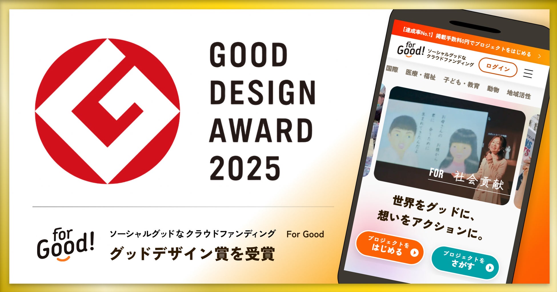株式会社ボーダレス・ジャパン(本社:福岡県福岡市、代表取締役CEO:田口 一成)が運営するソーシャルグッドに特化したクラウドファンディングサービス「For Good」(事業代表:小松 航大)は、このたび 2025年度グッドデザイン賞(主催:公益財団法人日本デザイン振興会) を受賞いたしました。