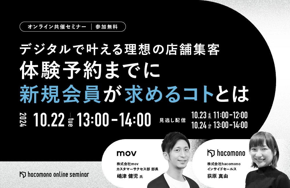 口コミサイトを”もっと”売上に変える、店舗向け集客一元化プラットフォーム「口コミコム」を運営する株式会社mov(代表取締役:渡邊 誠、本社:東京都渋谷区、以下mov)は、10月22日(火)13:00〜14:00よりオンラインでセミナーを配信します。参加費は無料です。