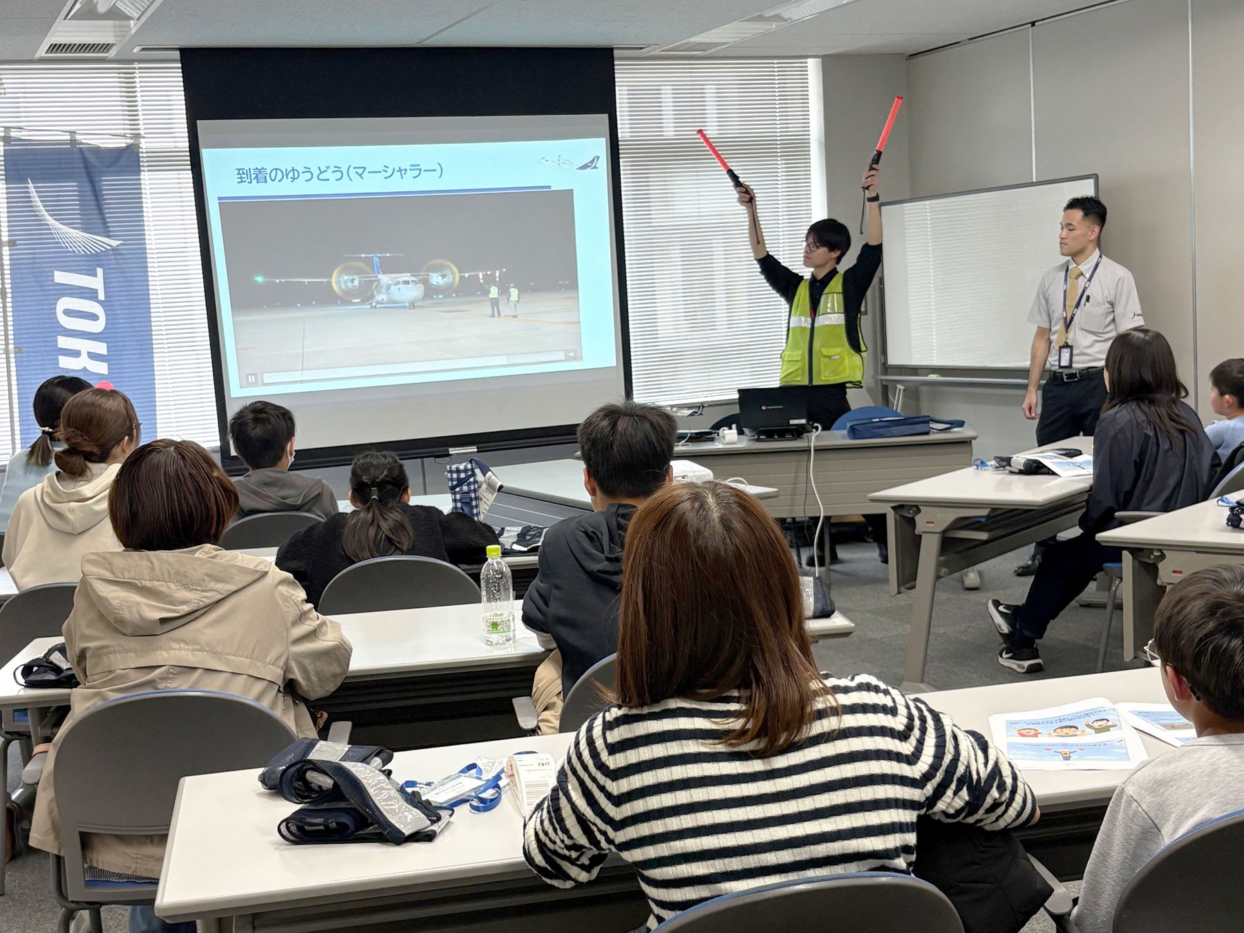 座学では、トキエアの職員から、飛行機の仕組みやグランドハンドリングをはじめとする空の仕事について説明を受けました。講義の途中には、実際の手荷物タグを自分の持ち物に取り付ける体験も行われ、親子で航空会社スタッフの仕事を身近に感じながら学びました。