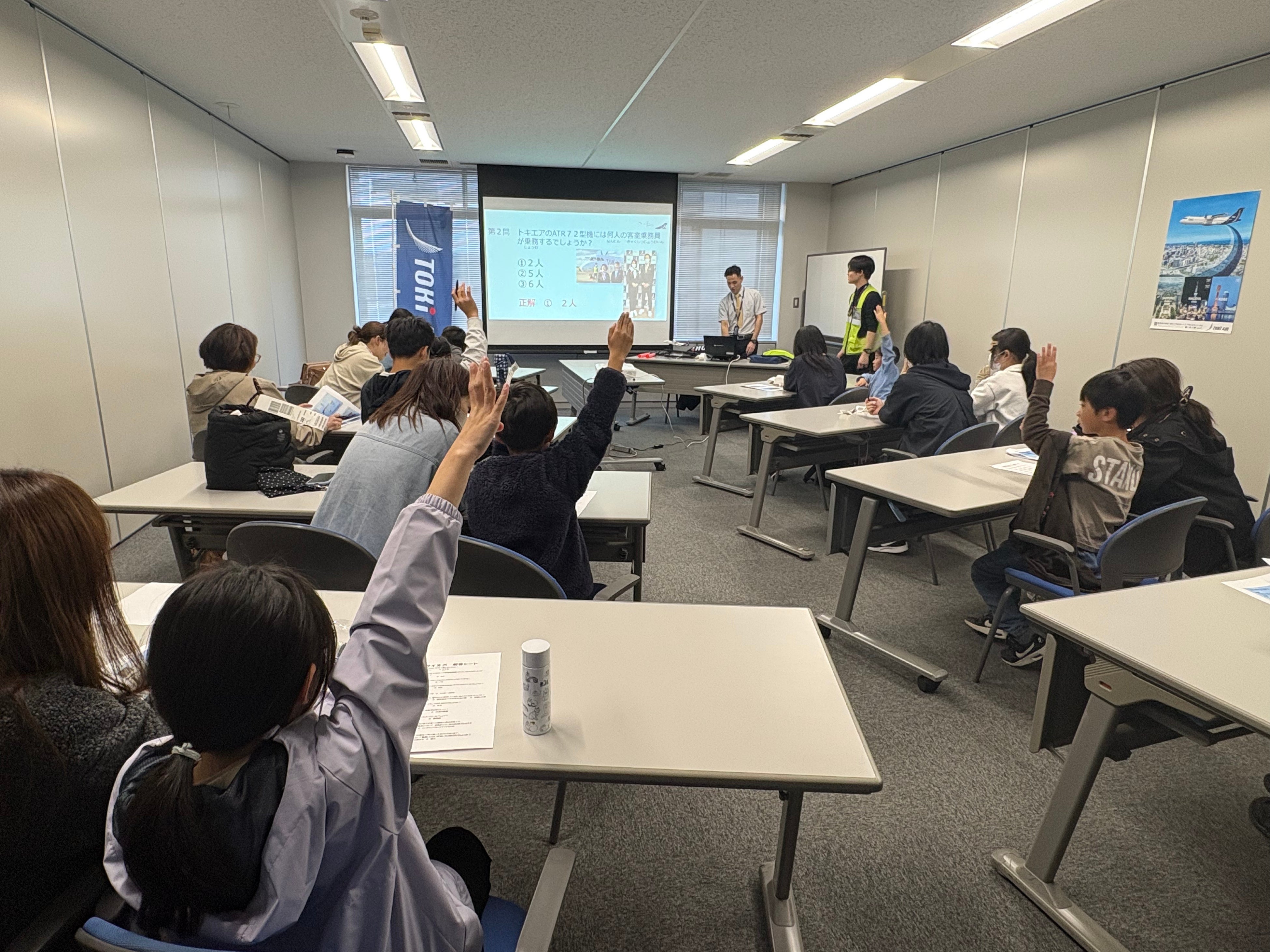 トキエア機のお見送りを終えた後、親子は部屋に戻り、学んだ内容を振り返るクイズ大会に挑戦しました。半日かけてじっくり学んだ成果もあり、次々と正解を重ね、会場は大いに盛り上がりました。こうして、楽しいおしごと見学会は満足の中で締めくくられました。