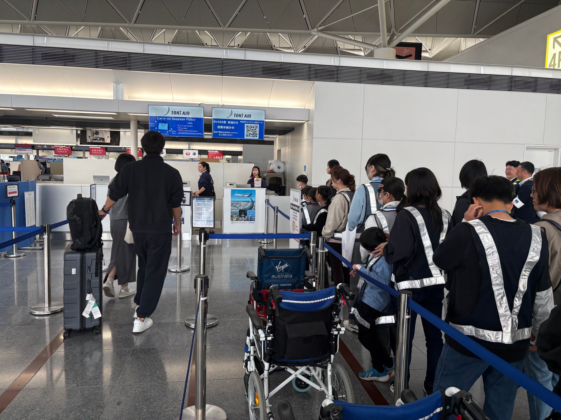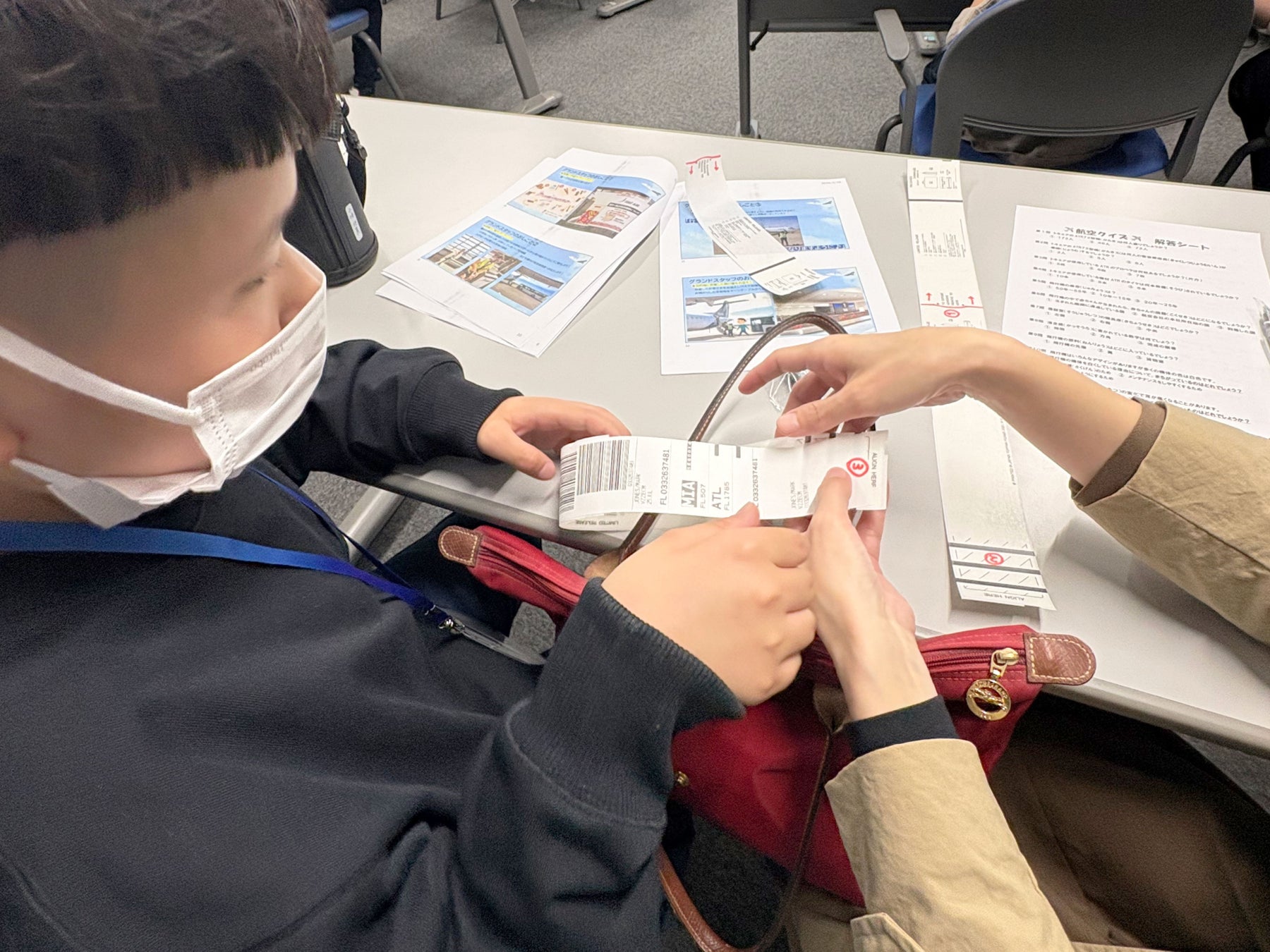 座学の後は、トキエアのカウンターを見学しました。チェックイン時間を迎えると、次々とお客様がカウンターを訪れ、受付が進んでいきます。てきぱきと対応するカウンタースタッフの動きや、座学で体験した荷物タグが実際に貼られ、預けられていく一連の流れを見ることで、航空会社の仕事をより身近に感じることができました。