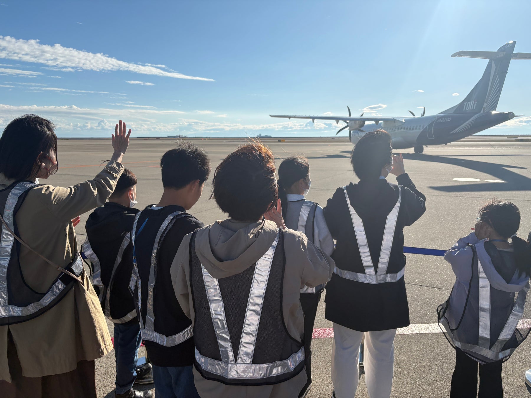 トキエアの飛行機についてじっくり学んだ楽しい時間はあっという間に過ぎ、飛行機は、新たなお客様を乗せて新潟空港へと旅立つ時間となりました。すっかりトキエアの機体と親しくなった親子は、名残惜しそうに、いつまでも手を振り続けていました。