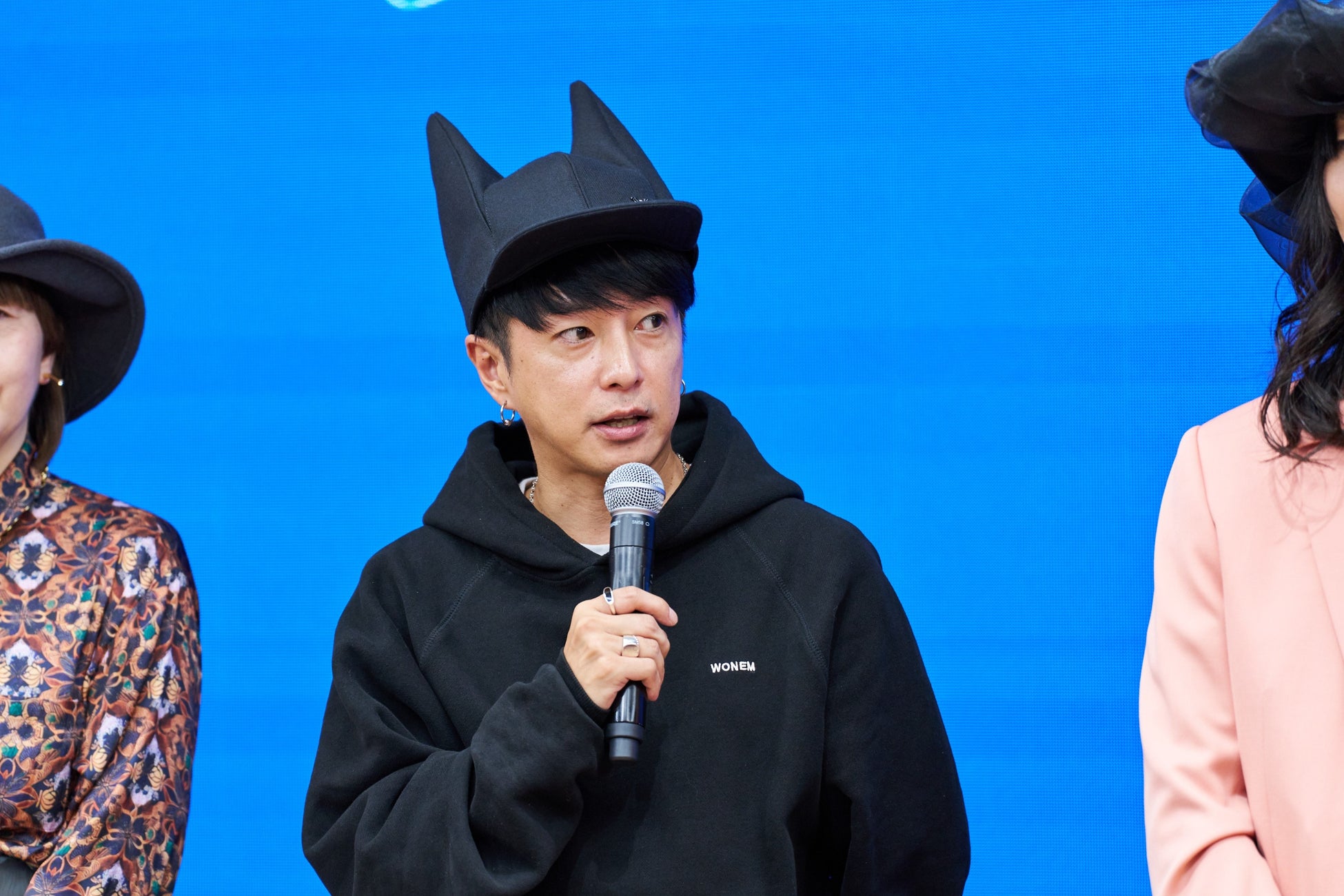 <登壇者>貝印株式会社 社長 遠藤浩彰/貝印株式会社 CCO/CMO 鈴木曜/日爪ノブキ氏(Hat & Head-piece designer)/田中文江氏(ファッションデザイナー)/奈良裕也氏(SHIMA ヘアメイクアップアーティスト)