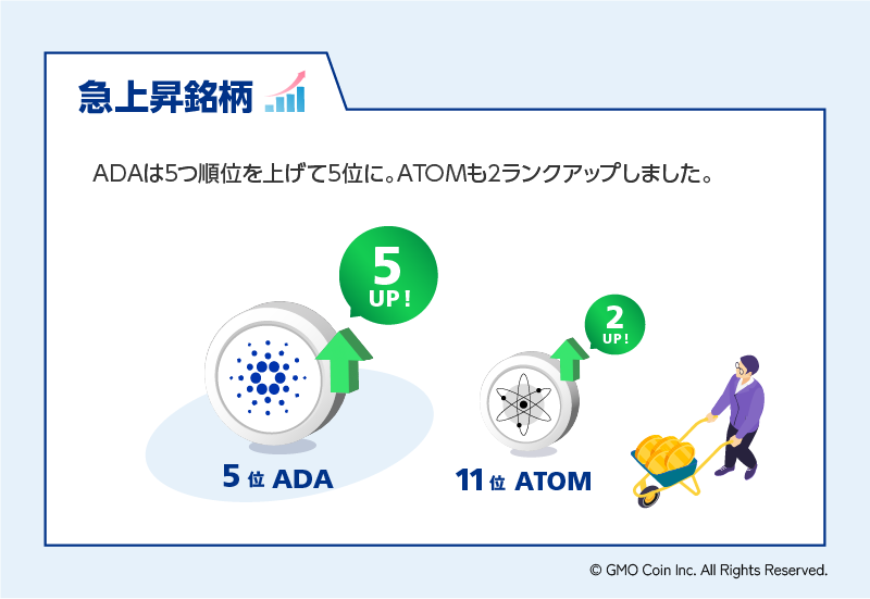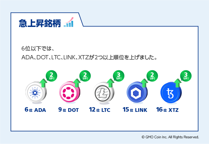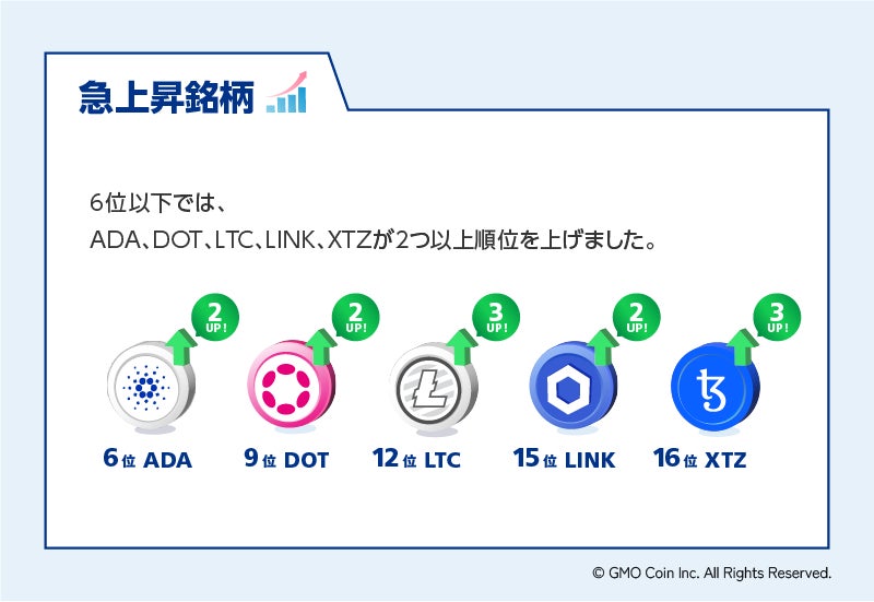 そのほかの銘柄では、カルダノ(ADA)が2ヶ月連続で上昇し、6位にランクインしました。