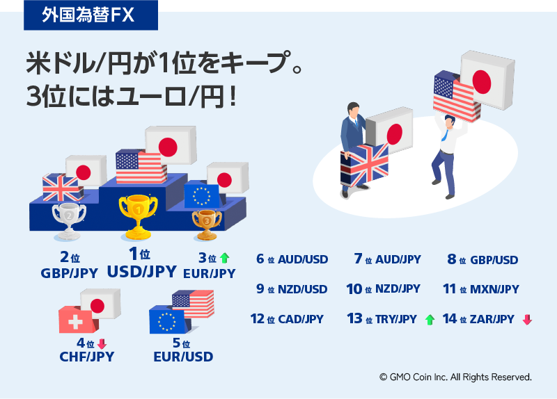 「外国為替FX」では、USD/JPY(米ドル/円)とGBP/JPY(ポンド/円)がそれぞれ順位をキープする中、3位にはEUR/JPY(ユーロ/円)がランクインしました。