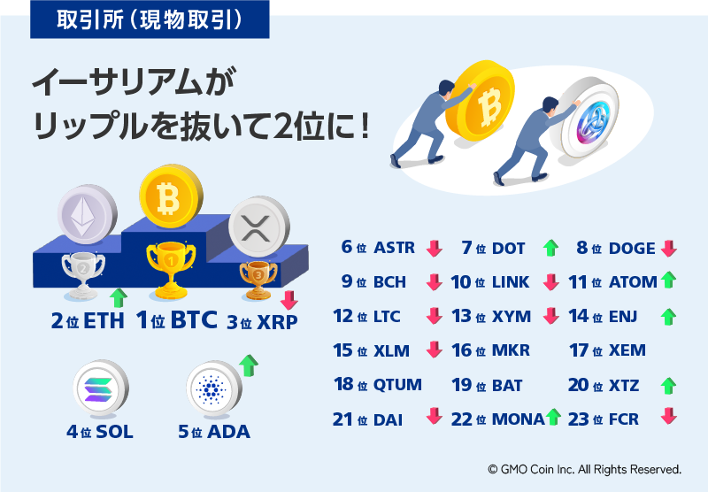 「取引所(現物取引)」では、イーサリアム(ETH)が2023年4月ぶりにリップル(XRP)を追い抜き2位になりました。