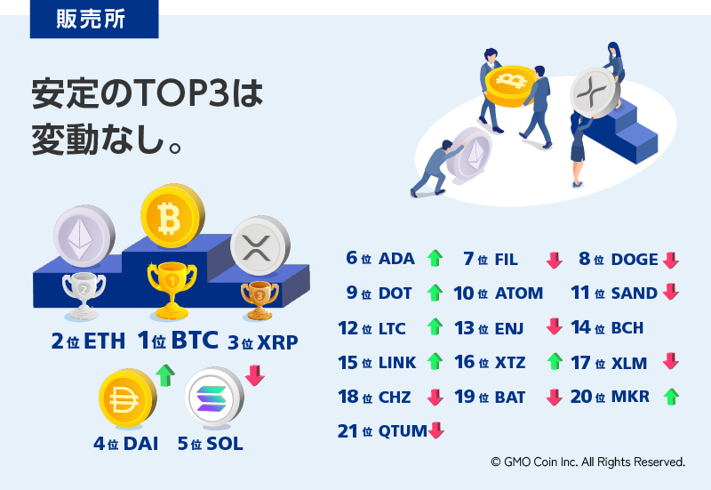 「販売所」では、TOP3銘柄に変動はなく、2023年8月から5ヶ月連続でビットコイン(BTC)が1位となりました。イーサリアム(ETH)は、順位の変動はないものの、シェアを伸ばしており3位のリップル(XRP)とは大きく差をつけています。