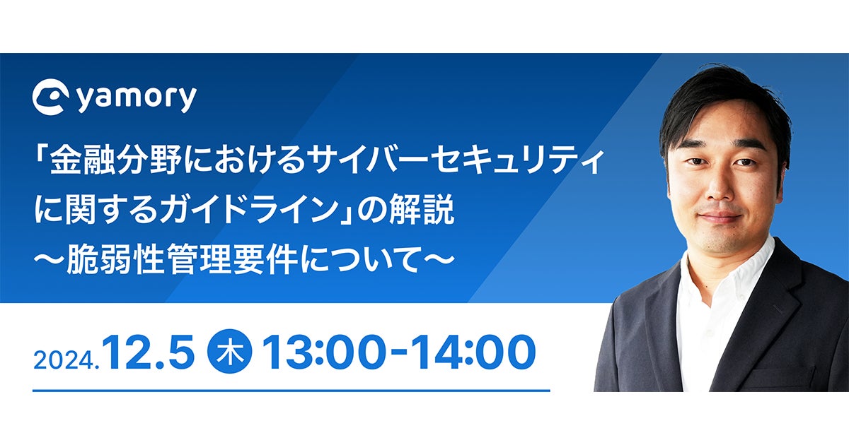 株式会社アシュアード(本社:東京都渋谷区、代表取締役社長:大森 厚志)が運営する、脆弱性管理クラウド「yamory(ヤモリー)」(https://yamory.io/ 以下、yamory)は、 2024年12月5日(木)に「金融分野におけるサイバーセキュリティに関するガイドライン」脆弱性管理要件の解説ウェビナーを開催することをお知らせいたします。