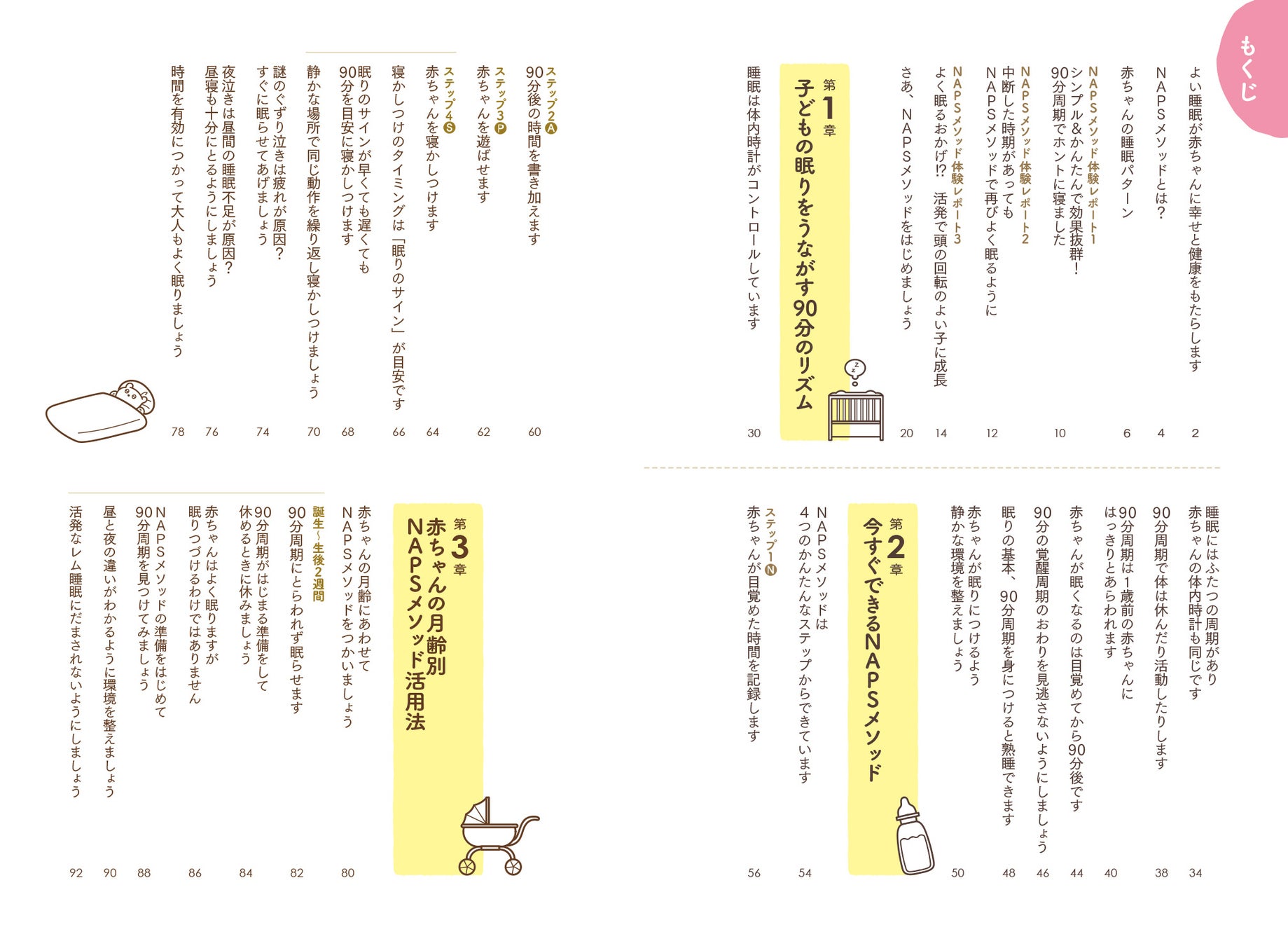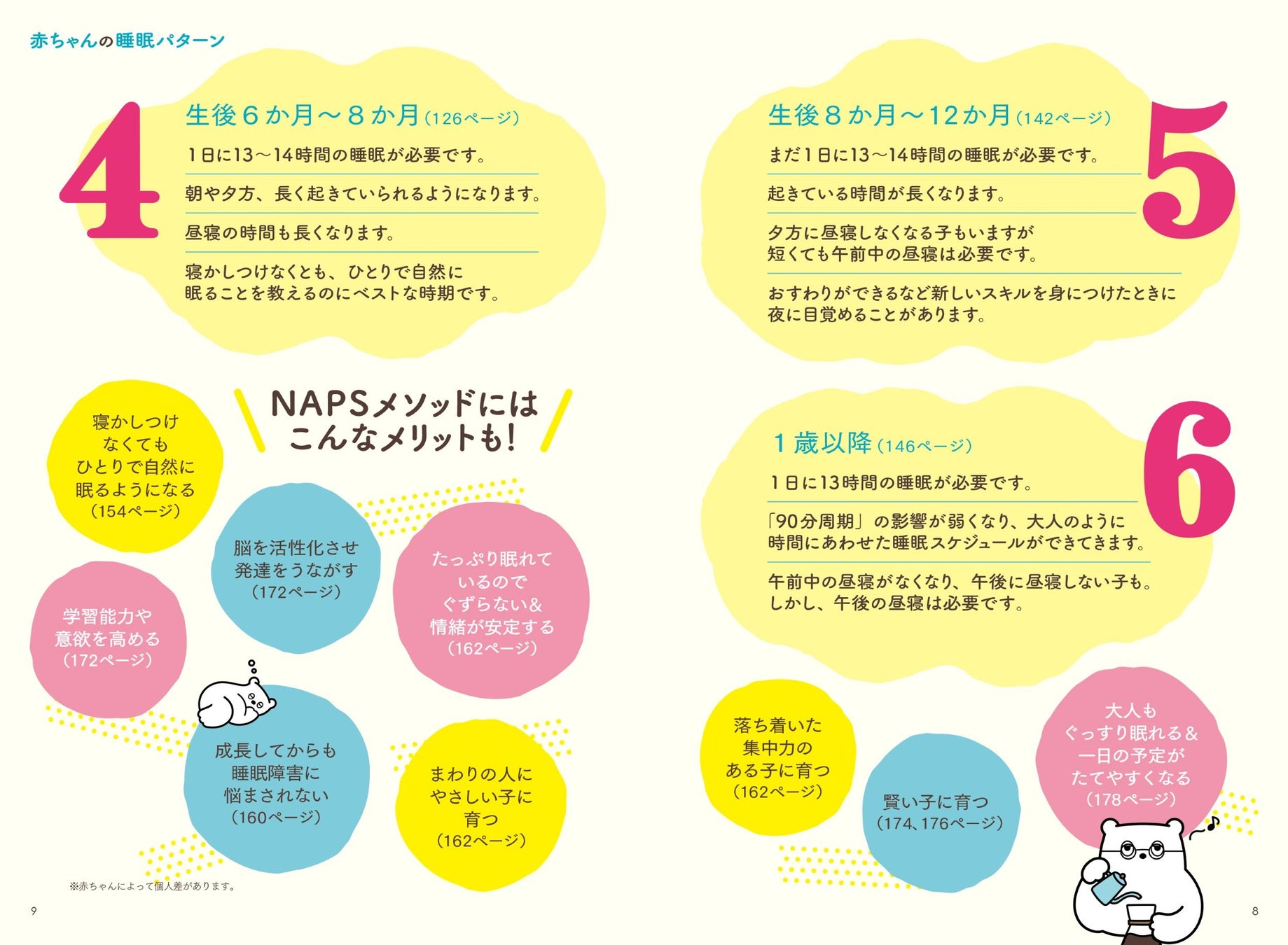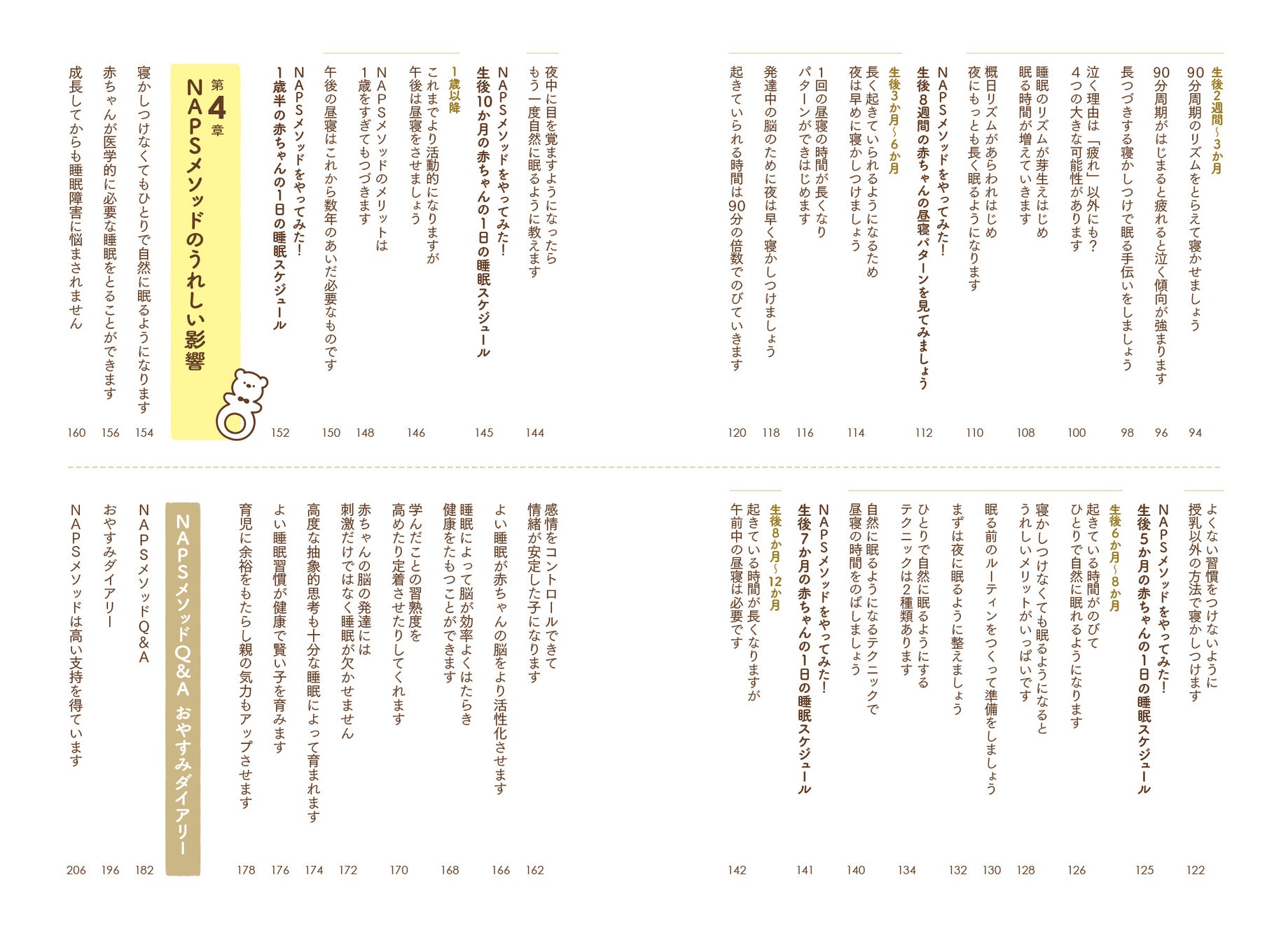 誕生から1歳以降まで発達段階にあわせた月齢別NAPSメソッドの活用法も紹介します。赤ちゃんの成長と睡眠の変化に対応できます。NAPSメソッドはもちろん、寝かしつけや昼寝など赤ちゃんの睡眠にまつわるさまざまな質問に答えるQ&Aも掲載しています。巻末の「おやすみダイアリー」は、赤ちゃんの成長記録にもなるでしょう。