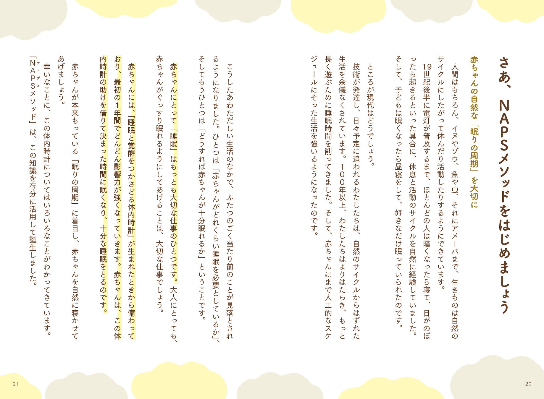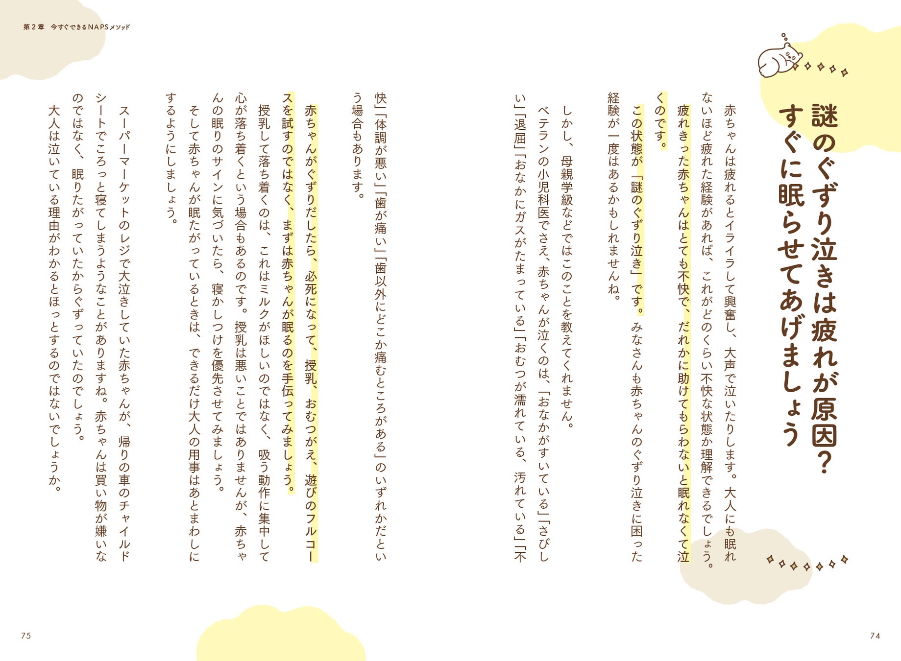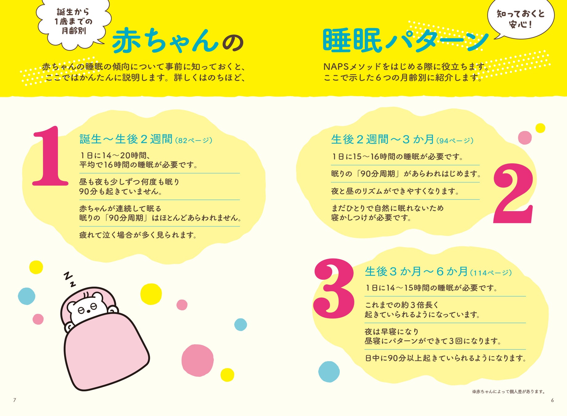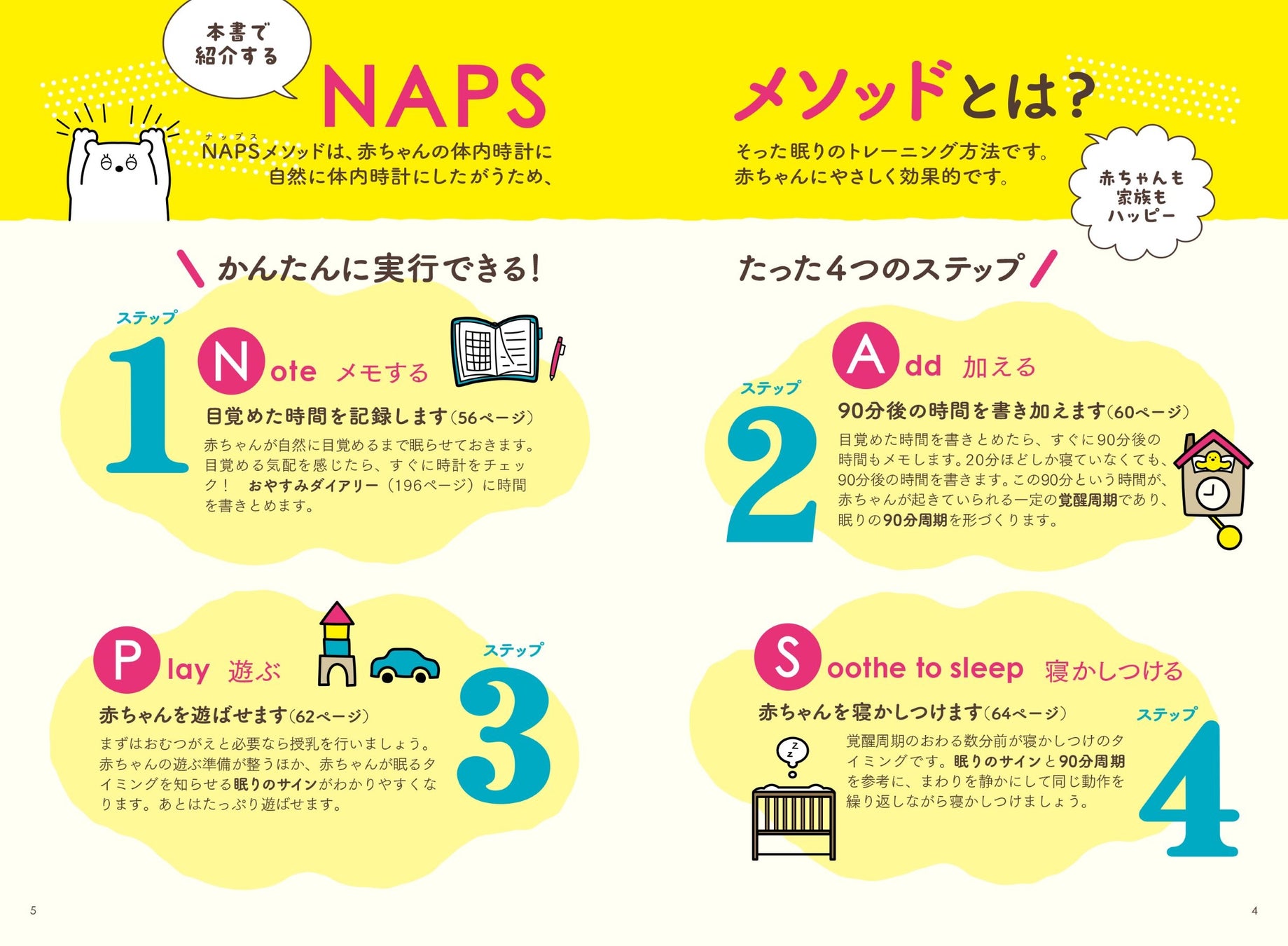 誕生から1歳以降まで発達段階にあわせた月齢別NAPSメソッドの活用法も紹介します。赤ちゃんの成長と睡眠の変化に対応できます。NAPSメソッドはもちろん、寝かしつけや昼寝など赤ちゃんの睡眠にまつわるさまざまな質問に答えるQ&Aも掲載しています。巻末の「おやすみダイアリー」は、赤ちゃんの成長記録にもなるでしょう。