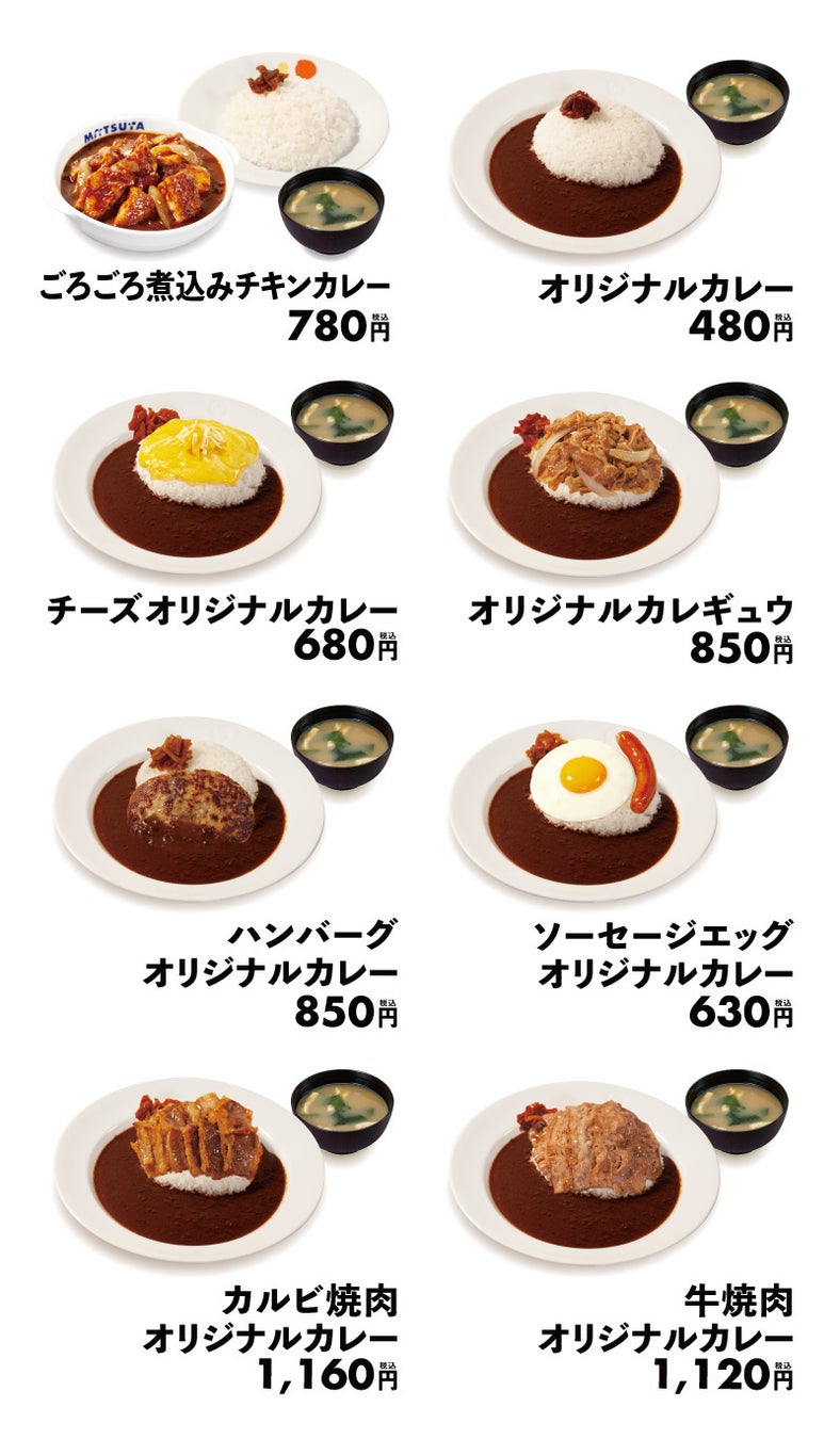 こだわりのスパイス配合で本格派と人気を博した「オリジナルカレー」がレギュラーメニューとして復活します。松屋の「オリジナルカレー」は、すっきりとした辛さをお楽しみ頂けるスパイシーな味わいです。この度、鉄板でジューシーに焼き上げたごろっごろのチキンがスパイスの効いたソースと相性抜群の大人気「ごろごろ煮込みチキンカレー」を筆頭に、まろやかな味わいが楽しい「チーズオリジナルカレー」、定番「ハンバーグオリジナルカレー」、旨味の詰まった牛肉と一緒に味わえる「オリジナルカレギュウ」「カルビ焼肉オリジナルカレー」「牛焼肉オリジナルカレー」、さらに目にも鮮やか「ソーセージエッグオリジナルカレー」、生野菜がついた「オリジナルカレーランチ」も同時販売いたします。この機会にぜひ、ご賞味ください。