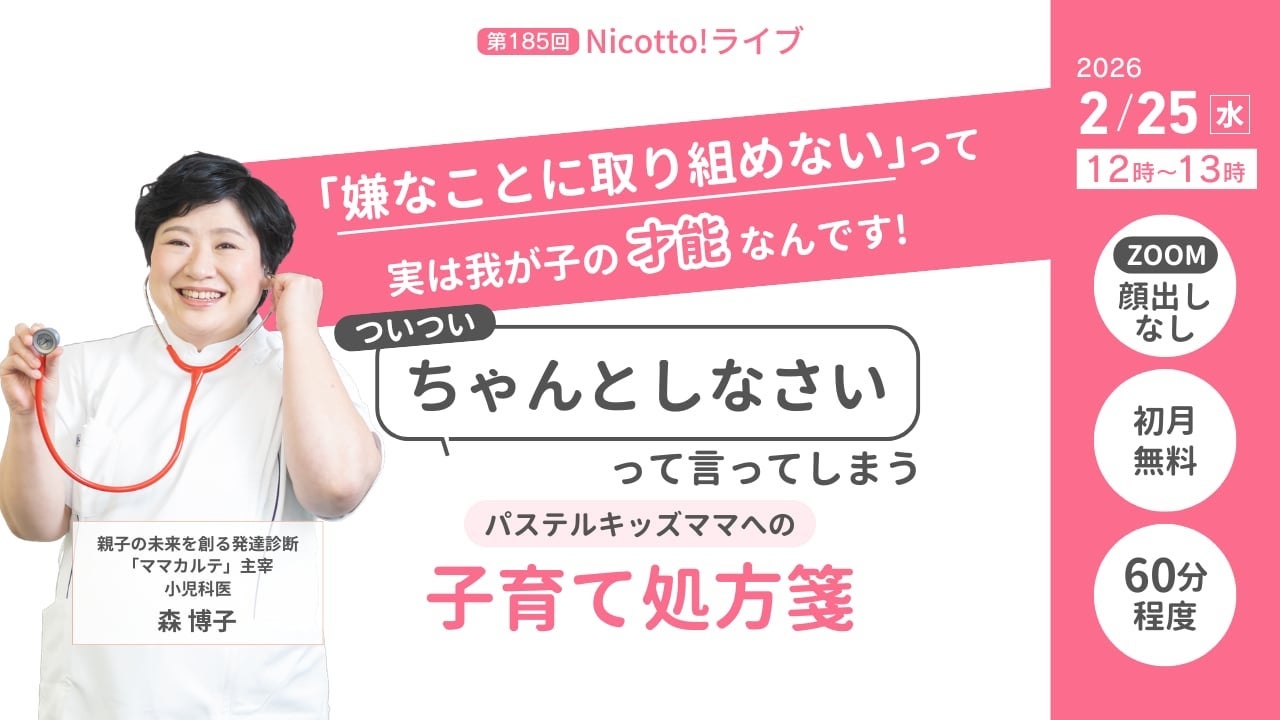 (株)パステルコミュニケーション(本社:東京都豊島区、代表取締役:吉野加容子)が運営する、発達障害・グレーゾーンの子どもを育てるママがいつでも学べて相談できるオンライン子育て塾「Nicotto!塾」は、2026年2月25日(水)お昼12時より、「『嫌なことに取り組めない』って実はわが子の才能なんです!ついついちゃんとしなさいって言ってしまうパステルキッズママへの子育て処方箋」をテーマにオンラインライブを開催いたします。