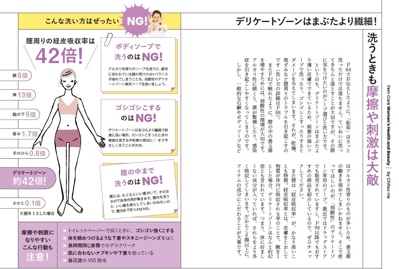 詳細なイラストで、膣まわりのケアについて解説しています。自分ではなかなかじっくり見ることのないデリケートゾーンですが、ちつ姉いわく「毎日、鏡で肌を見るように、膣も鏡で見てケアしてほしい」とのこと。もっと自分の体をきちんと理解して、適したケアをすることで、デリケートゾーンのトラブルだけでなく、美肌にもつながるというから驚き。ノーファンデなのにお肌つるつるのちつ姉が自信を持っておすすめするケア法です。