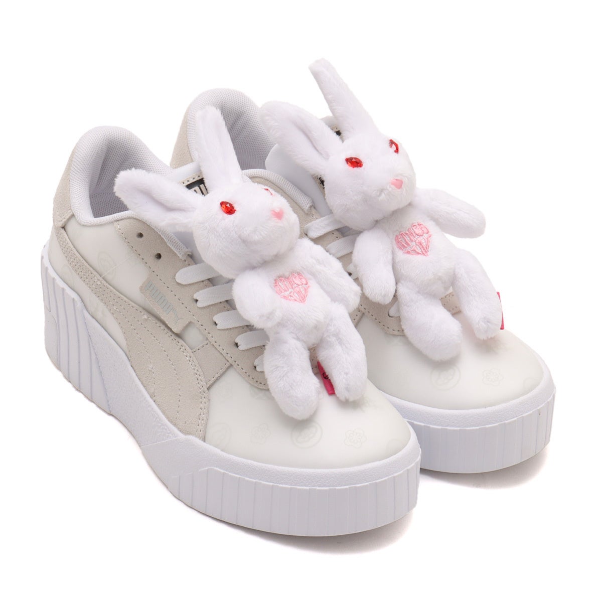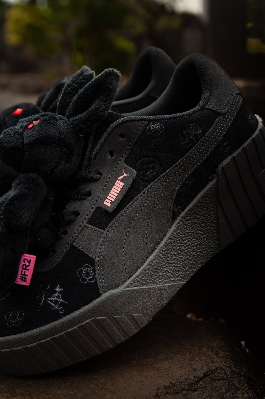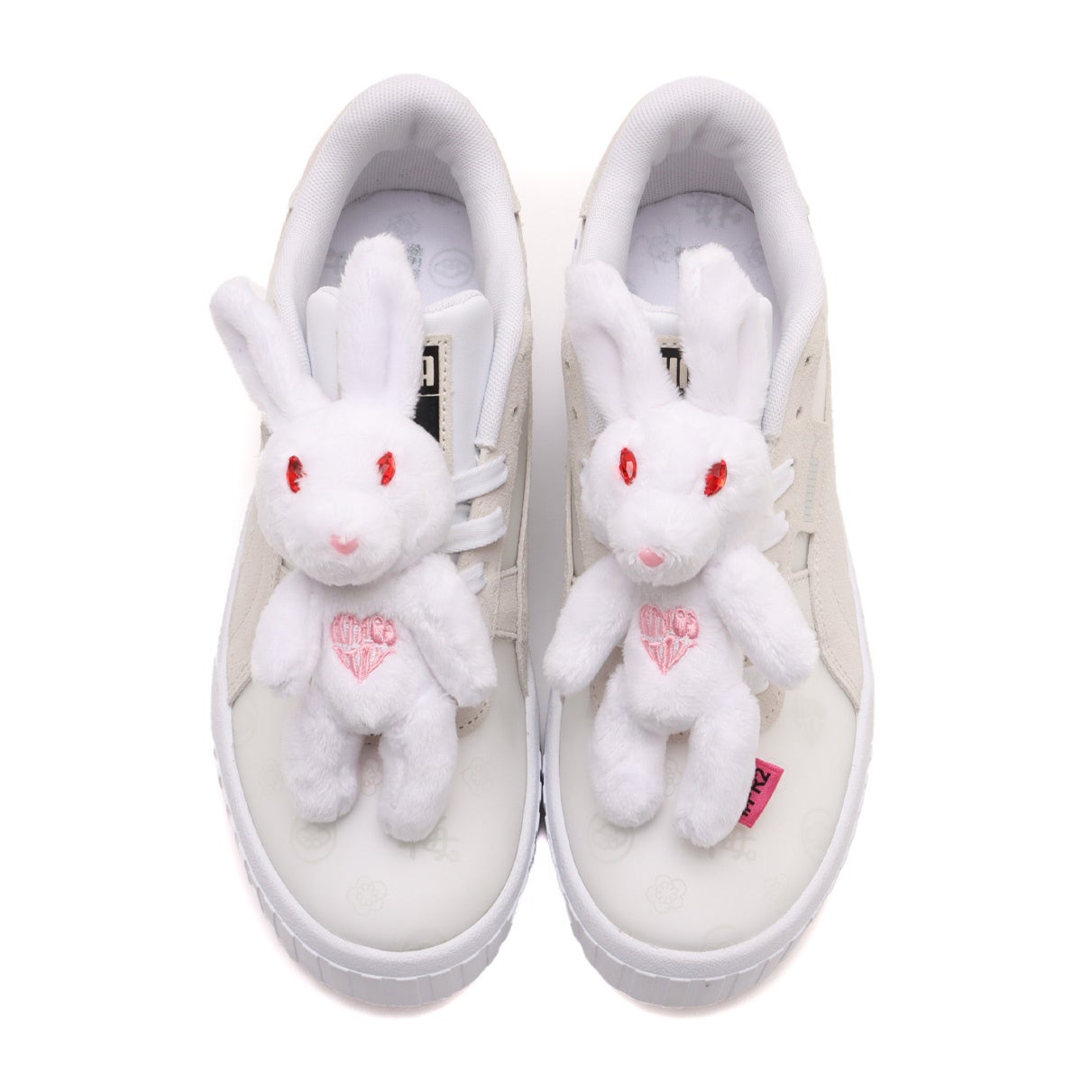 本コラボレーションでは#FR2梅のブランドアイコンでもある“Fxxking Rabbits”から白と黒の立体的なうさぎが取り外し可能な仕様でスニーカーに設置されており、#FR2梅らしい独自の斬新で大胆なアイディアとPUMAの人気モデルCALI WEDGEのスタイリッシュなボディーが掛け合わさったデザインとなっています。