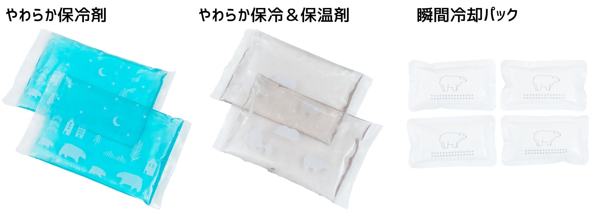 冷凍しても硬くならない保冷剤に加え、保冷&保温兼用タイプと瞬間冷却パックが初登場。