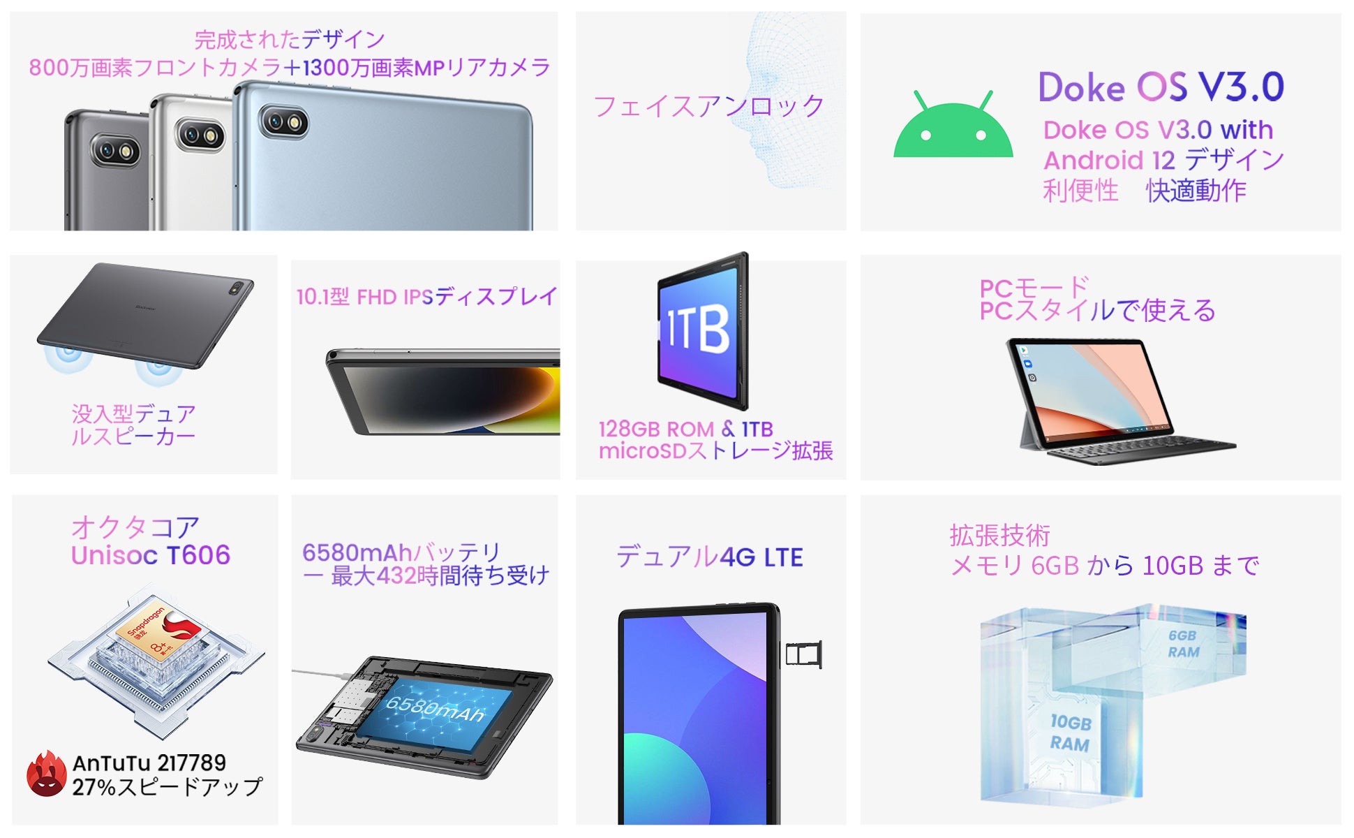 10インチ / Android 12 / 10GB+128GB+1TB拡張 / FHD IPSディスプレイ / Widevine L1対応 / 13MP+8MPカメラ / 4G LTEモデル / GPSサポート