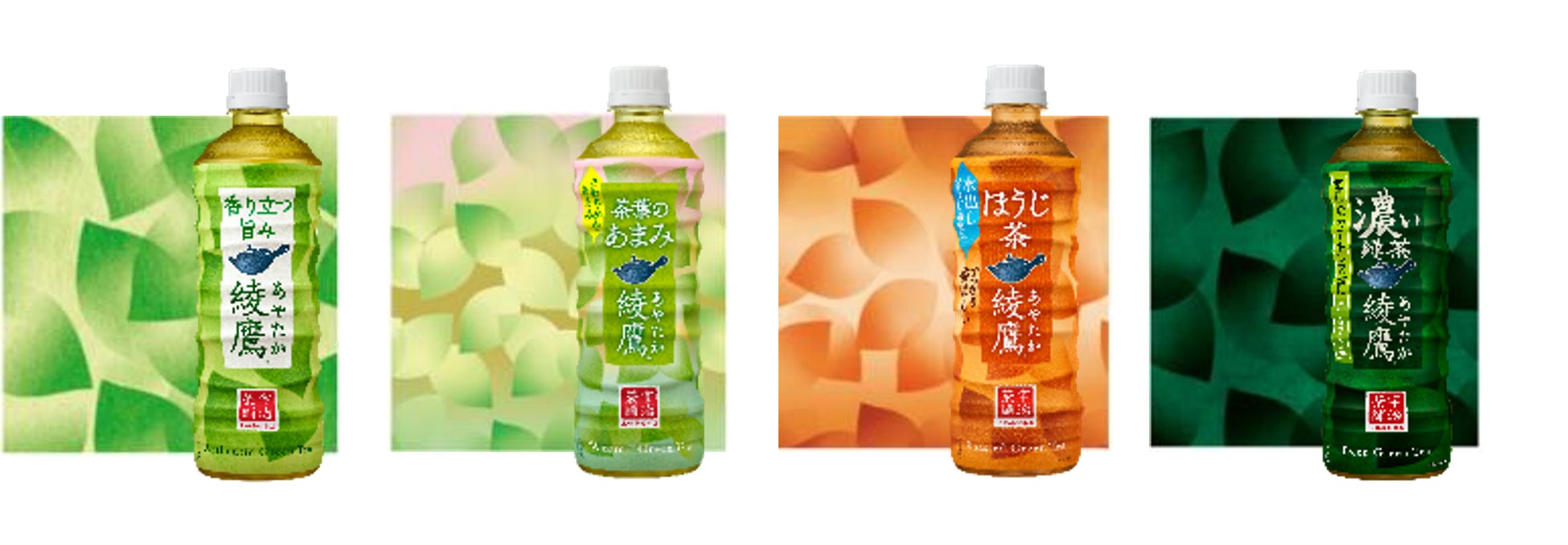 パッケージデザインは シリーズで刷新し、「綾鷹」、「綾鷹 茶葉のあまみ」、「綾鷹 ほうじ茶」、「綾鷹 濃い緑茶」それぞれの味わい特徴に合わせ、異なる茶葉グラデーションと色合いを用いています。伝統を重んじながら、お茶のおいしさを追求し進化しつづける「綾鷹」らしい新パッケージデザインで、緑茶の本格的な味わいと軽やかな飲み心地を五感でお楽しみください。