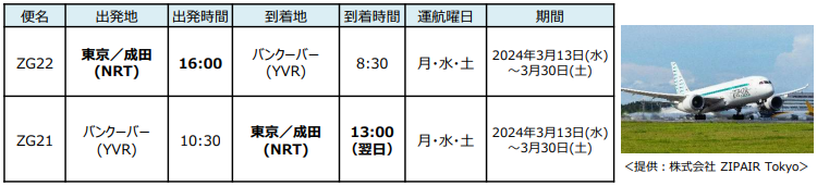 ZIPAIR(IATAコード:ZG)は、2024年3月13日(水)より、新たに成田=バンクーバー線に就航します。同路線は同社にとって北米4路線目となり、初のカナダ路線となります。成田空港からバンクーバーに最も朝早く到着する本路線は、現地での滞在時間を有効活用できるだけでなく、カナダ国内やアメリカ各地への接続利便性が向上することから、お客様の選択肢がさらに広がることを期待しております。