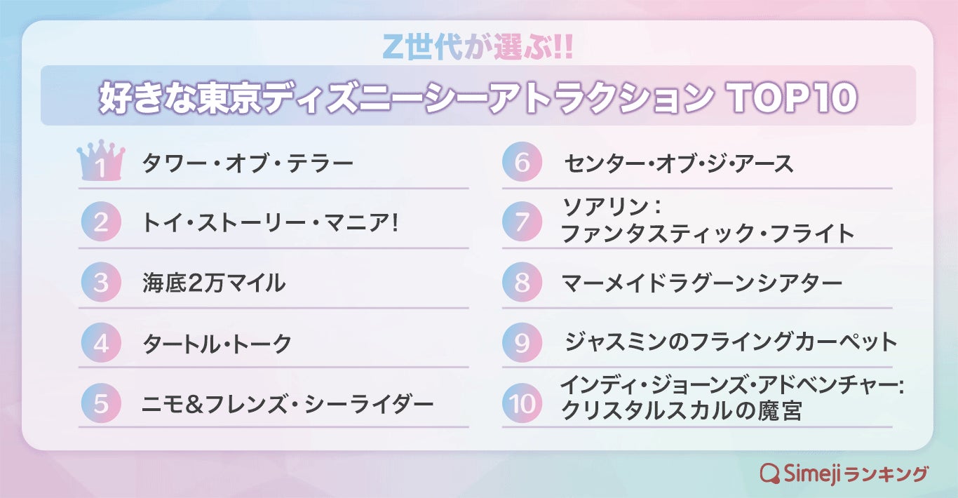 今回のテーマは、Z世代が選ぶ!! 「好きな東京ディズニーシーアトラクションTOP10」