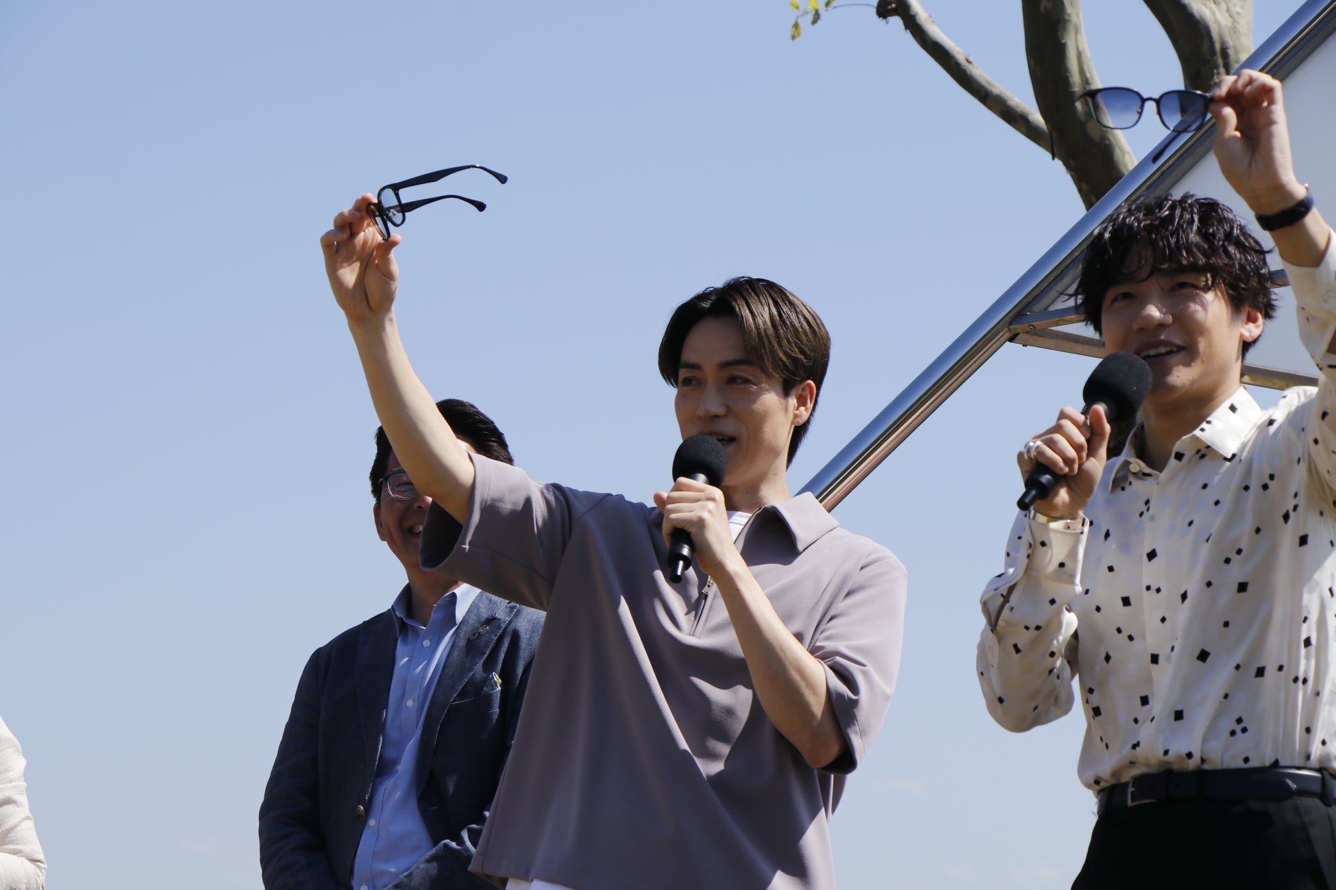 「今日の日を迎えられて嬉しいです!」と鯖江のサングラスをかけて登場したEXILE TETSUYAと小森隼(GENERASTIONS)。小森隼は「皆さんの笑顔が眩しくてサングラスかけさせてもらってます。」と、笑いを誘うひとコマも。