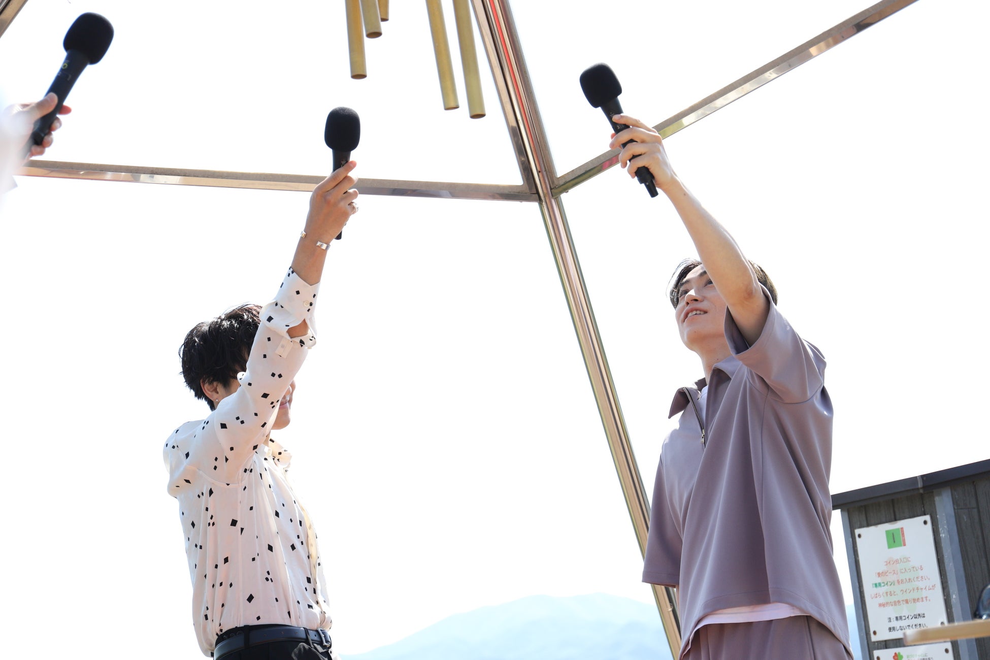 鯖江の印象、魅力について、小森隼は「景色がすごく好きで、このように見渡せる感じや街の風景や山も綺麗で、そこが一体になっているところが僕はとても好きで毎回来るたびに思います。昨年訪れためがねミュージアムのエレベーターの中からも景色が一望できて、その時も同じことを思いました。1年経って、僕も色々経験してきましたが、なお思うということは、自分の心の中にピッタリくる景色なんだと改めて思いました。」と、熱く語りました。トークショーの会場となった、鯖江市内が一望できる「西山公園結びの広場」。コインを入れるとチャイムが鳴り、ハート型の愛のピースに願い事を書いて、よつ葉のクローバーのモニュメントにくくりつけると願いが叶うということで、小森隼は「TETSUYAさんが今後10年、20年ずっと健康でありますように。」、