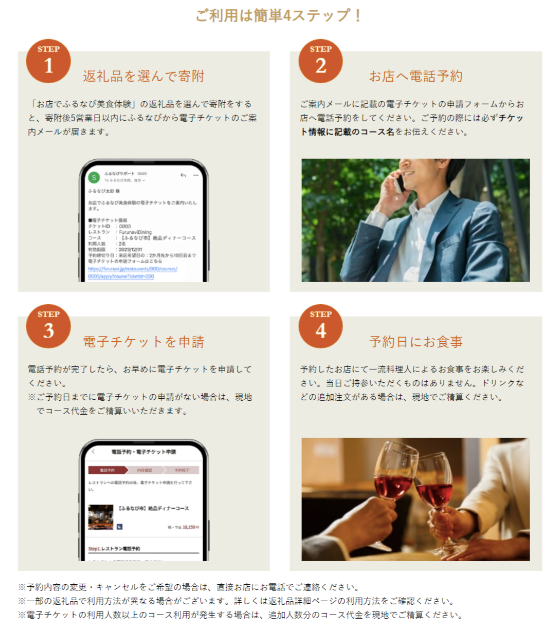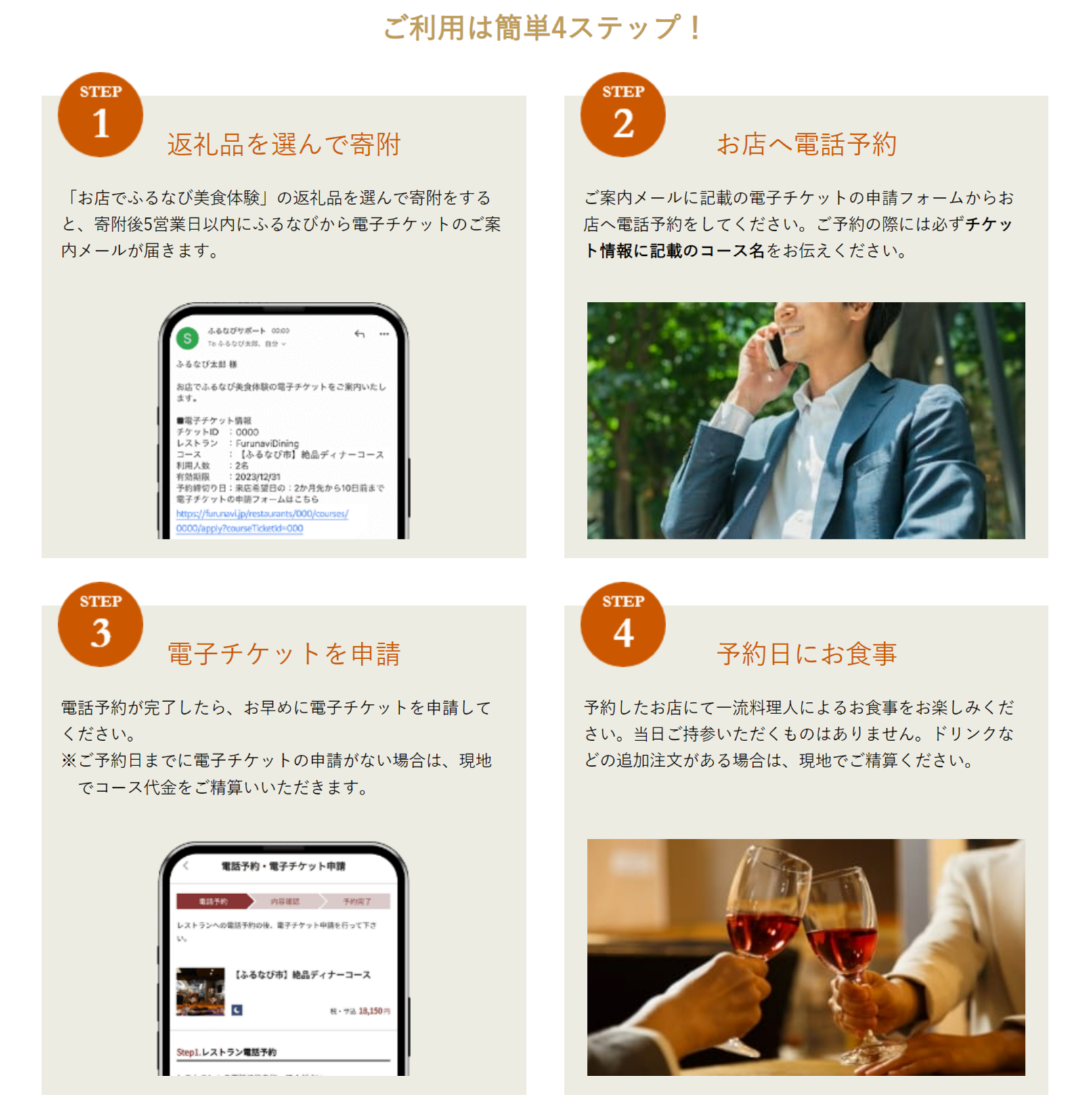 これまで【予約リクエストを受け、予約可否を返答する】形式を採用していましたが、寄附者様からの「ご予約に関する貴重な意見」ならびに飲食店舗の「予約業務負荷」を鑑み、【直接電話予約&電子チケット申請】形式へ一新しました。