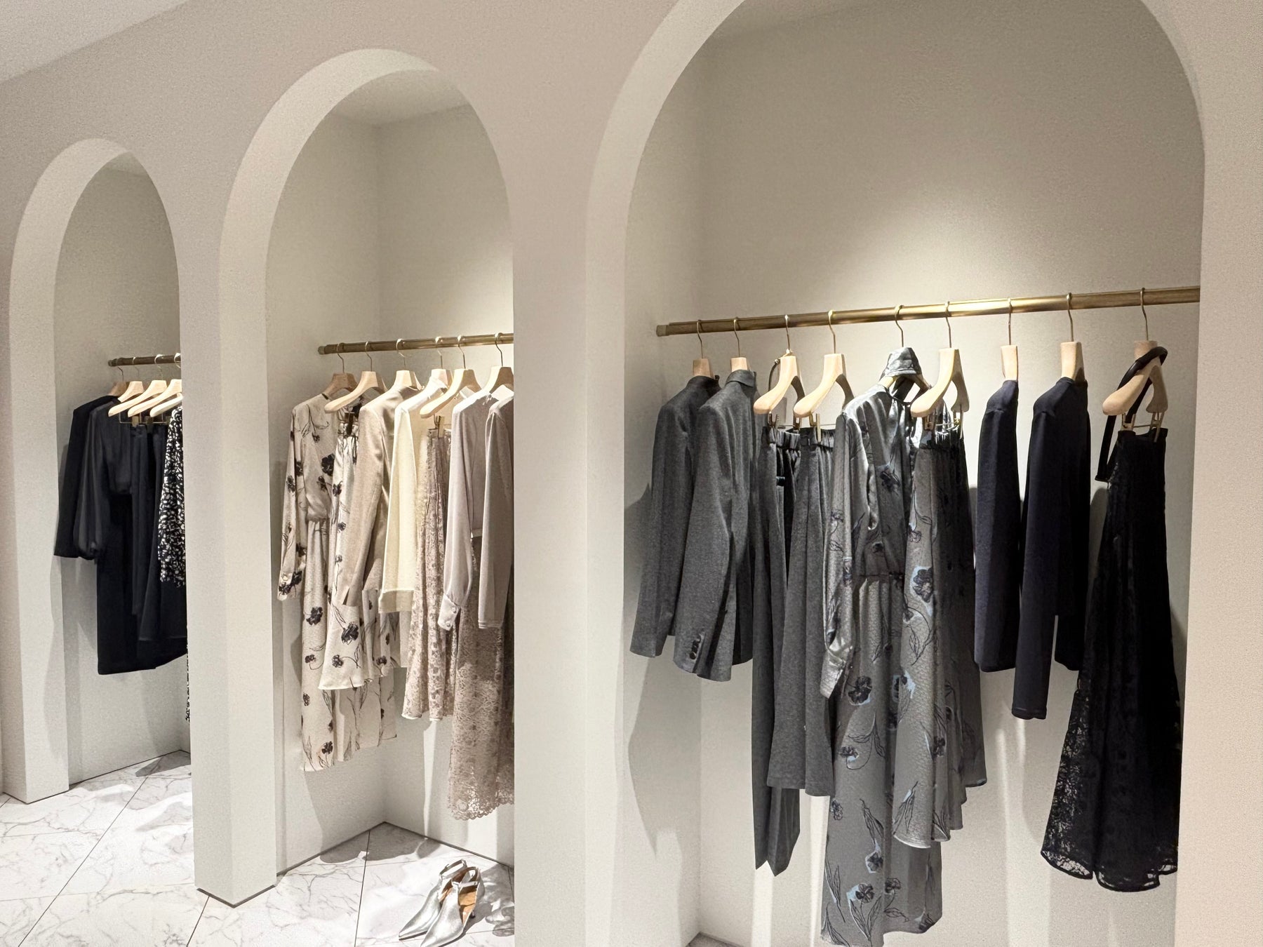 店装は、都会的で上質な時間を過ごせるようなイタリア・ミラノの街中にあるホテルをイメージしています。店内には円柱状の柱やアーチ状の装飾をあしらった壁などを配し、イタリアの格式を継承しながらもモダンで明るい洗練された空間にしています。ゴールドの装飾をポイントにした什器に季節の花々やグリーンを配置し、シーンに合わせた商品提案を行うことで直営店と同様のショップづくりをいたします。