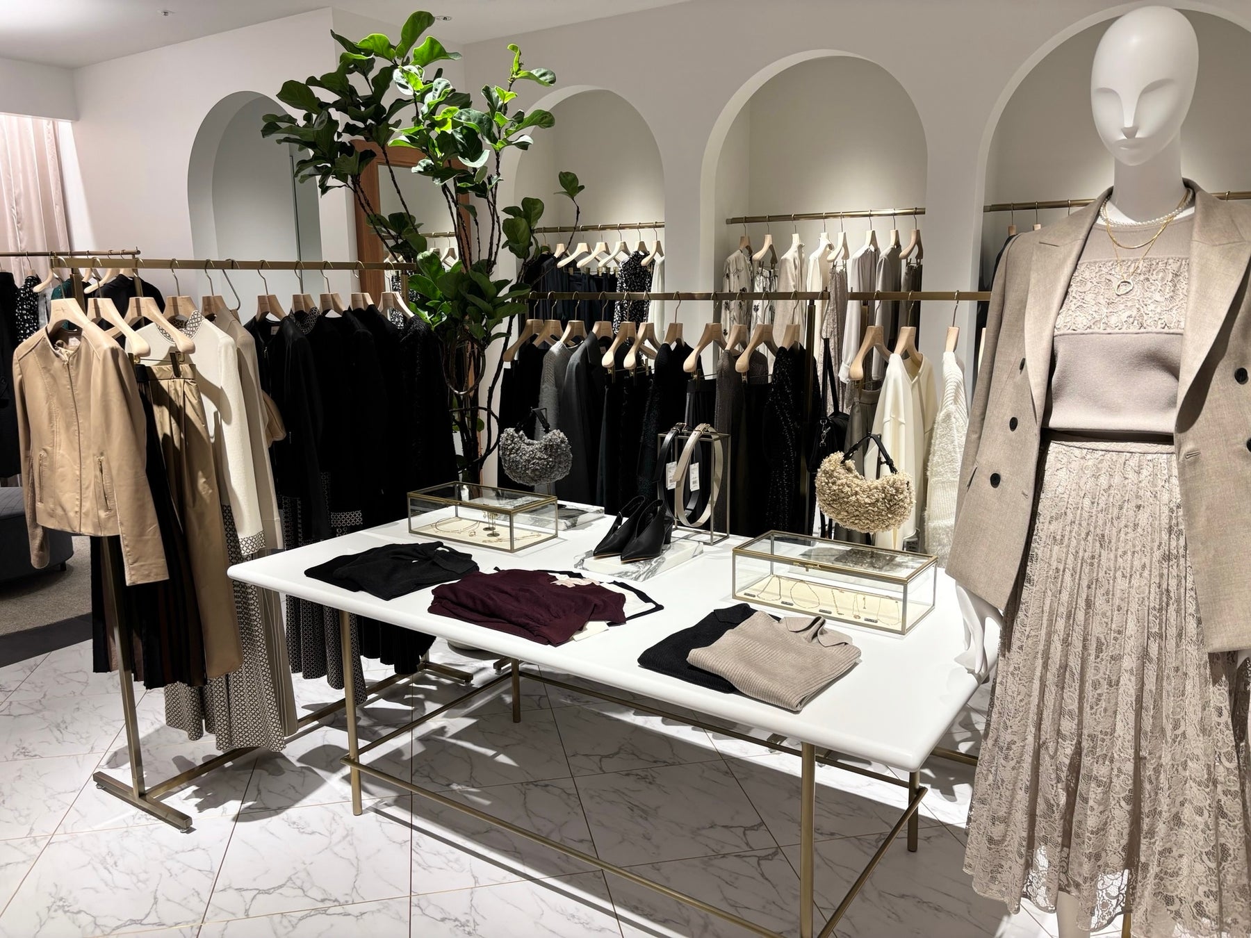 商品は、ウエア、アクセサリーなどの服飾雑貨を取り揃え、商品構成は当社オリジナルブランドの「エポカ」を70%、国内外の買付けブランド商品を20%、「エポカ ザ ショップ」の限定ラインである「エポカ ストリア」を10%の割合で展開します。多様性のあるファッションや生活スタイルを好む傾向があるお客さまに向けて多彩な商品を揃え、特にドレスアイテムは、デイリー、オフィシャル、ドレスアップのシーンに対応する品揃えを強化しました。様々なシーンのスタイリングができるよう雑貨を含めてトータルで提案いたします。