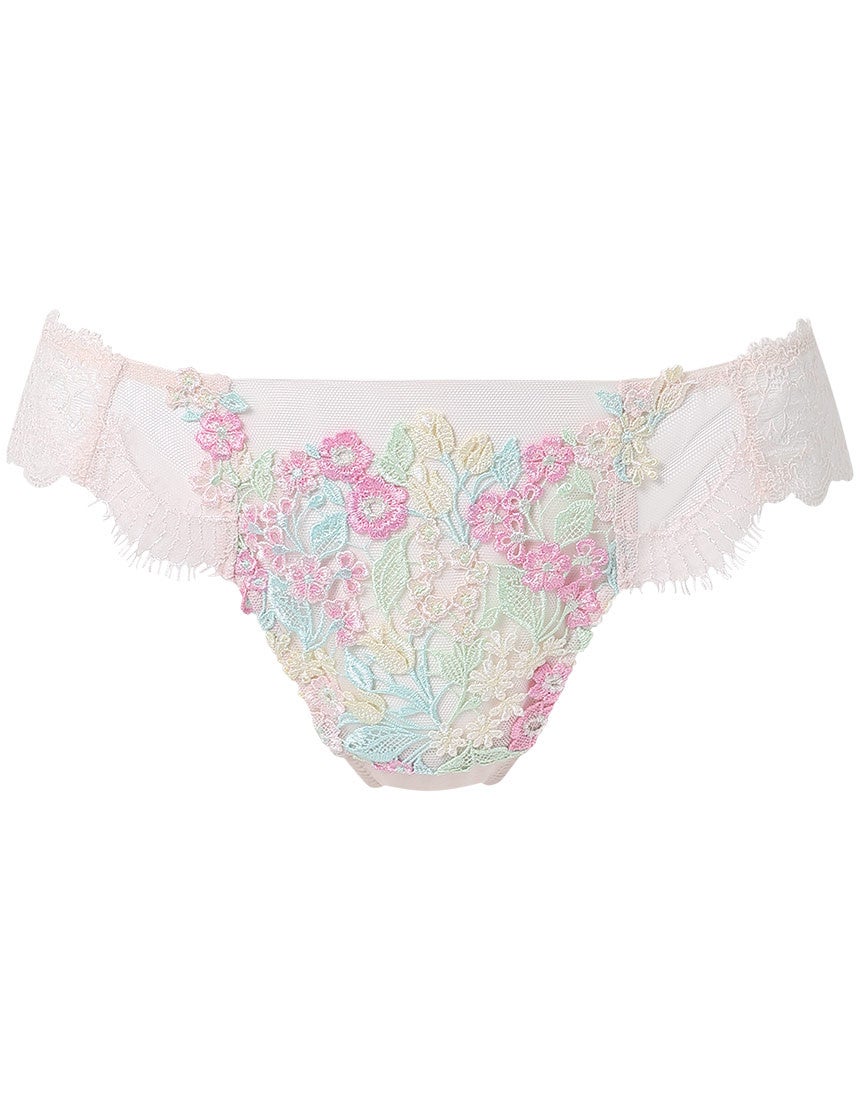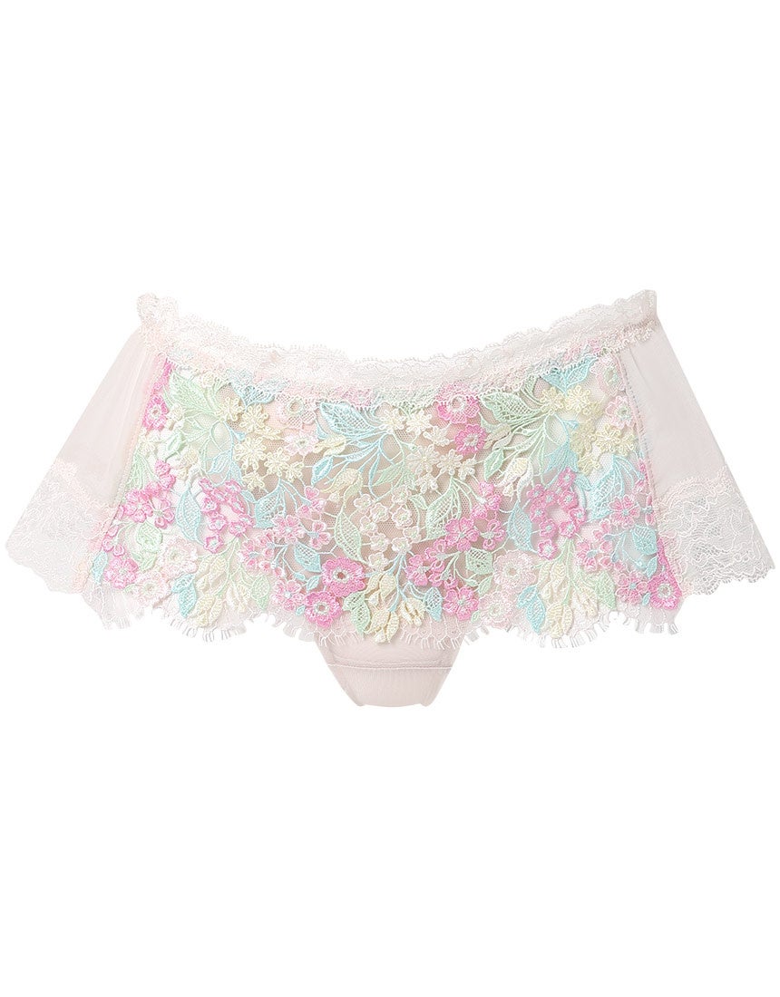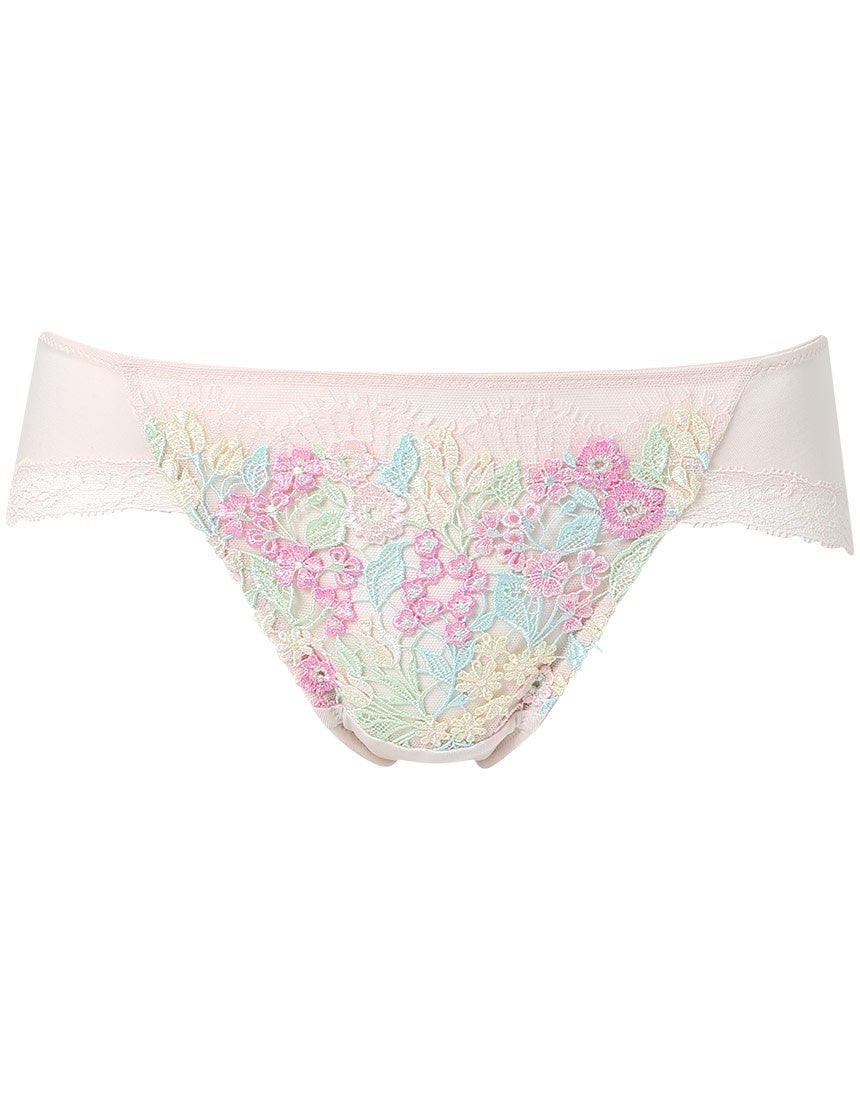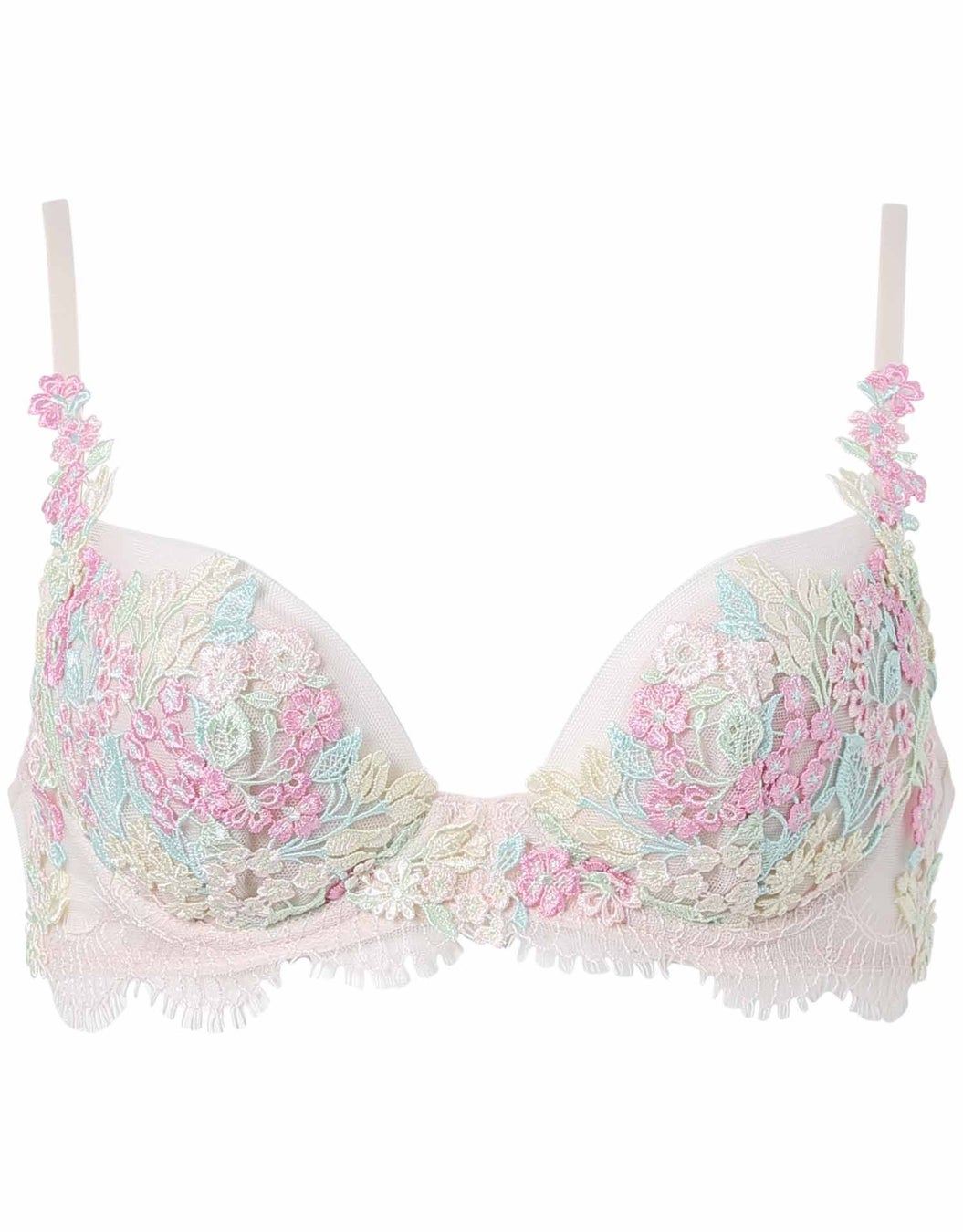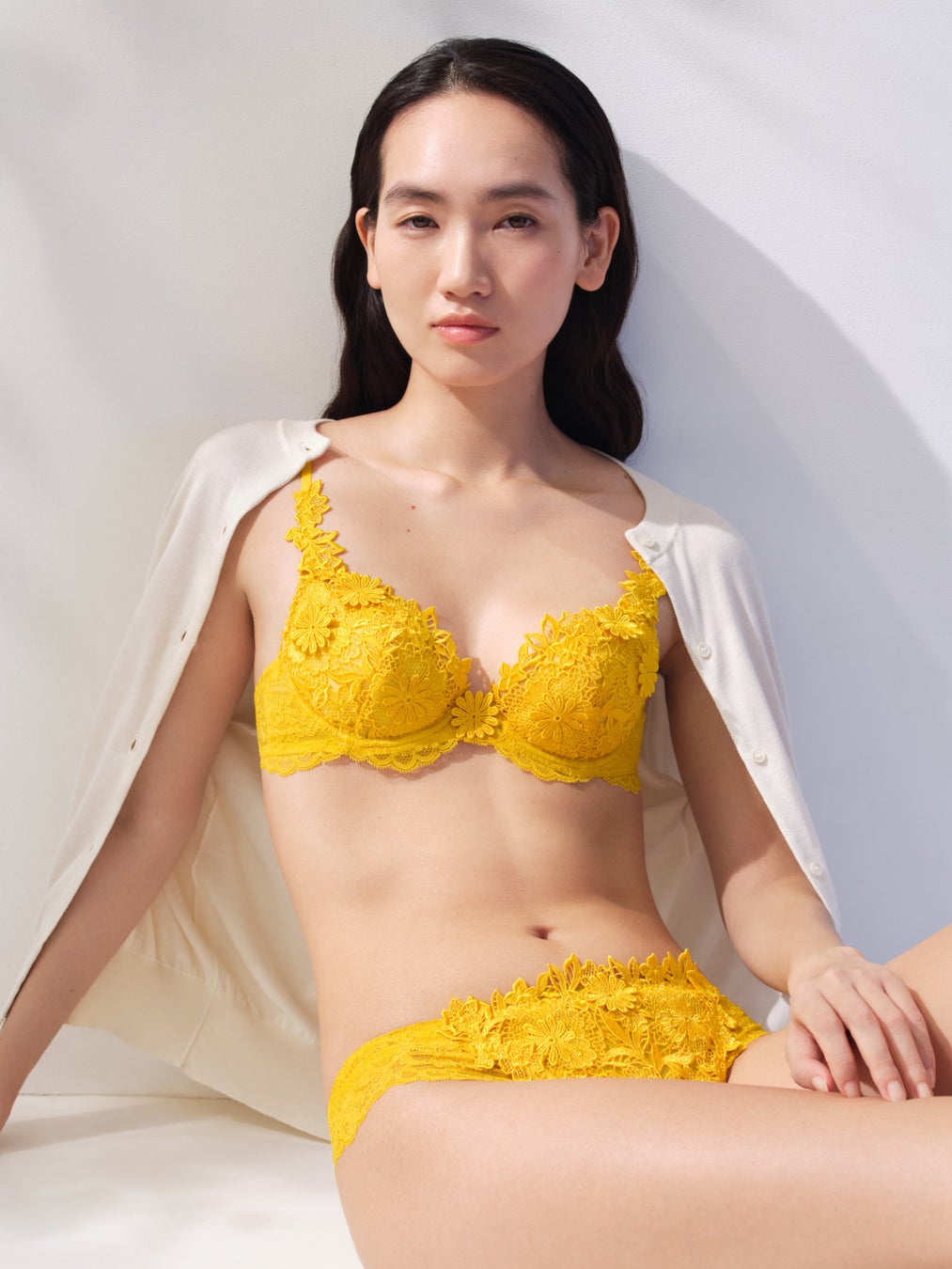 可憐な花々を束ねたロマンティックなブーケをそのままランジェリーに仕立てたような、 至福をまとうコレクションです。 古き良き時代のクチュール感あるレースを、大花モチーフと小花アップリケで新鮮にアップデートしました。刺繍の重なりに工夫を凝らし、奥行きのあるレースが美しさを際立たせます。花々がもつ甘さだけでなく、ナチュラルでモダンな雰囲気も取り入れました。