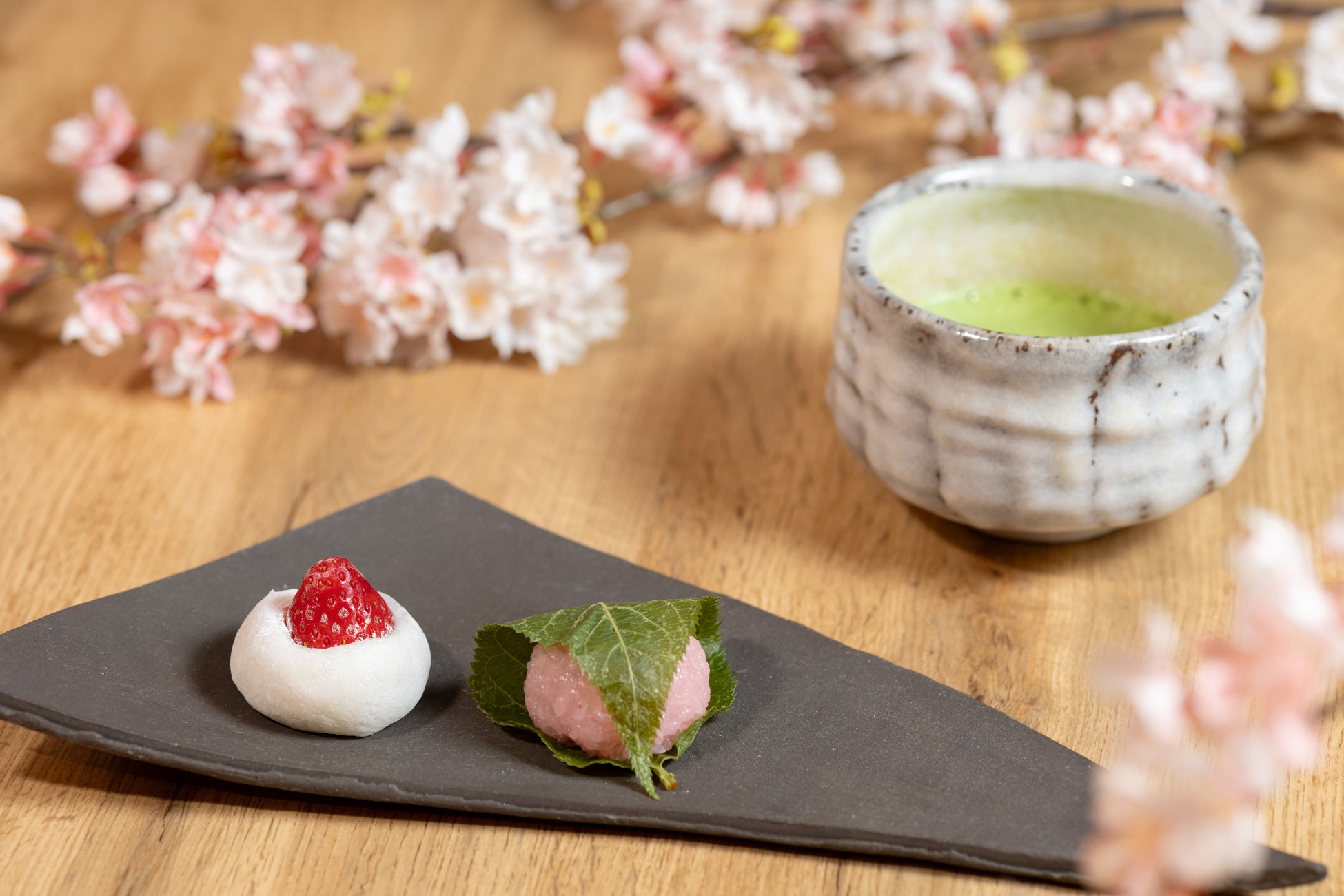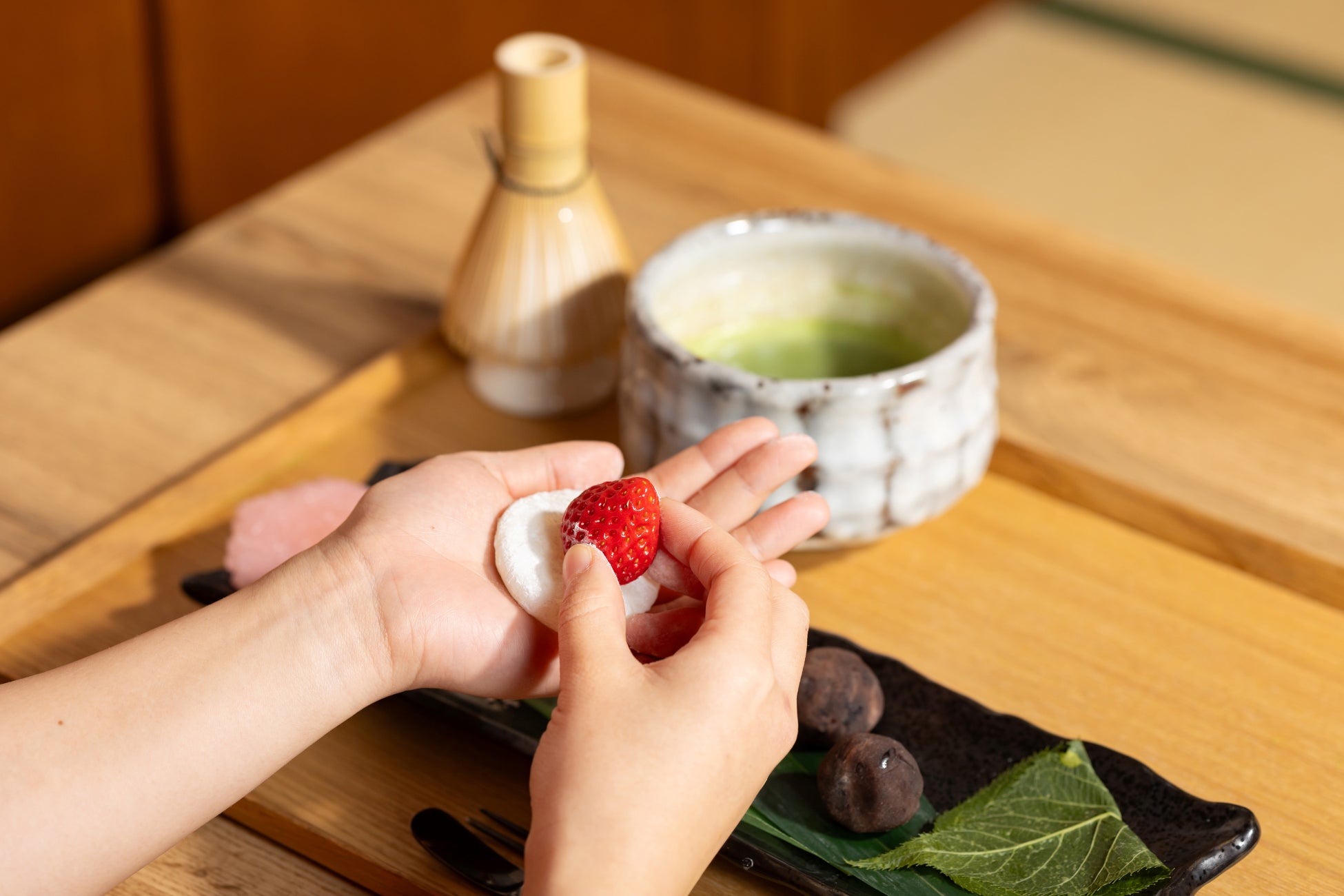 チェックイン後に、お客様ご自身でつくる和菓子とお抹茶のセットをご用意。和菓子は春らしい桜餅といちご大福を、お抹茶は岐阜県で創業100年を超える「瑞草園」の茶葉でお楽しみいただけます。簡単な内容なのでお子さまにもご体験いただけます。