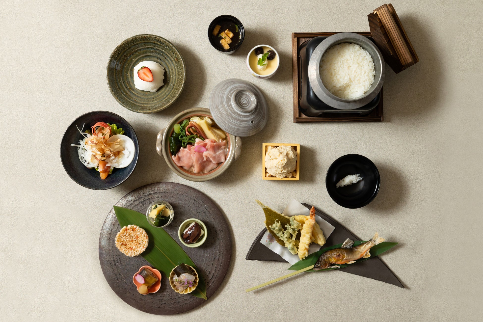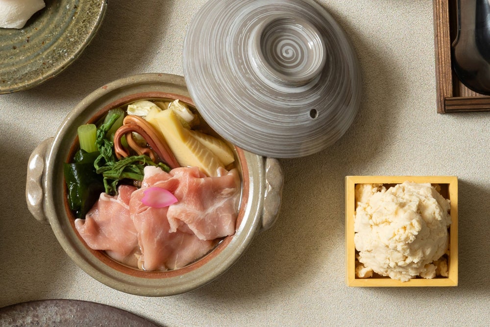 岐阜県産の食材にこだわり、岐阜の恵みと春の風情を味わっていただけるディナーコースをご用意しました。メインには岐阜県の郷土料理の「すったて鍋」をアレンジ。「すったて鍋」とは、古くから祝い事や晴れの場で親しまれている、大豆のみでつくられた非常に栄養価が高い郷土料理です。具材には飛騨豚や春野菜、山菜などをご用意。濃厚な味わいながらもあっさりとしており、食べやすく仕上げました。