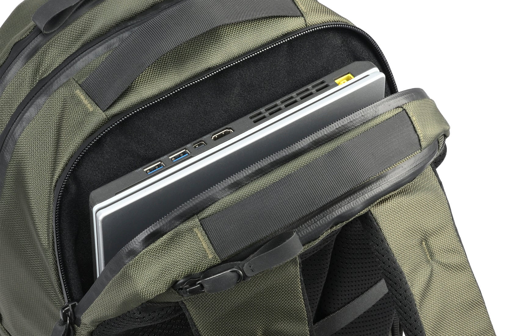 雨具に匹敵する優れた耐水圧(10,000mm 以上)を持つタフな本体生地と、水が浸入しにくいコーティングファスナーを採用。激しい雨から書類やガジェットを守ります。※完全防水ではございません