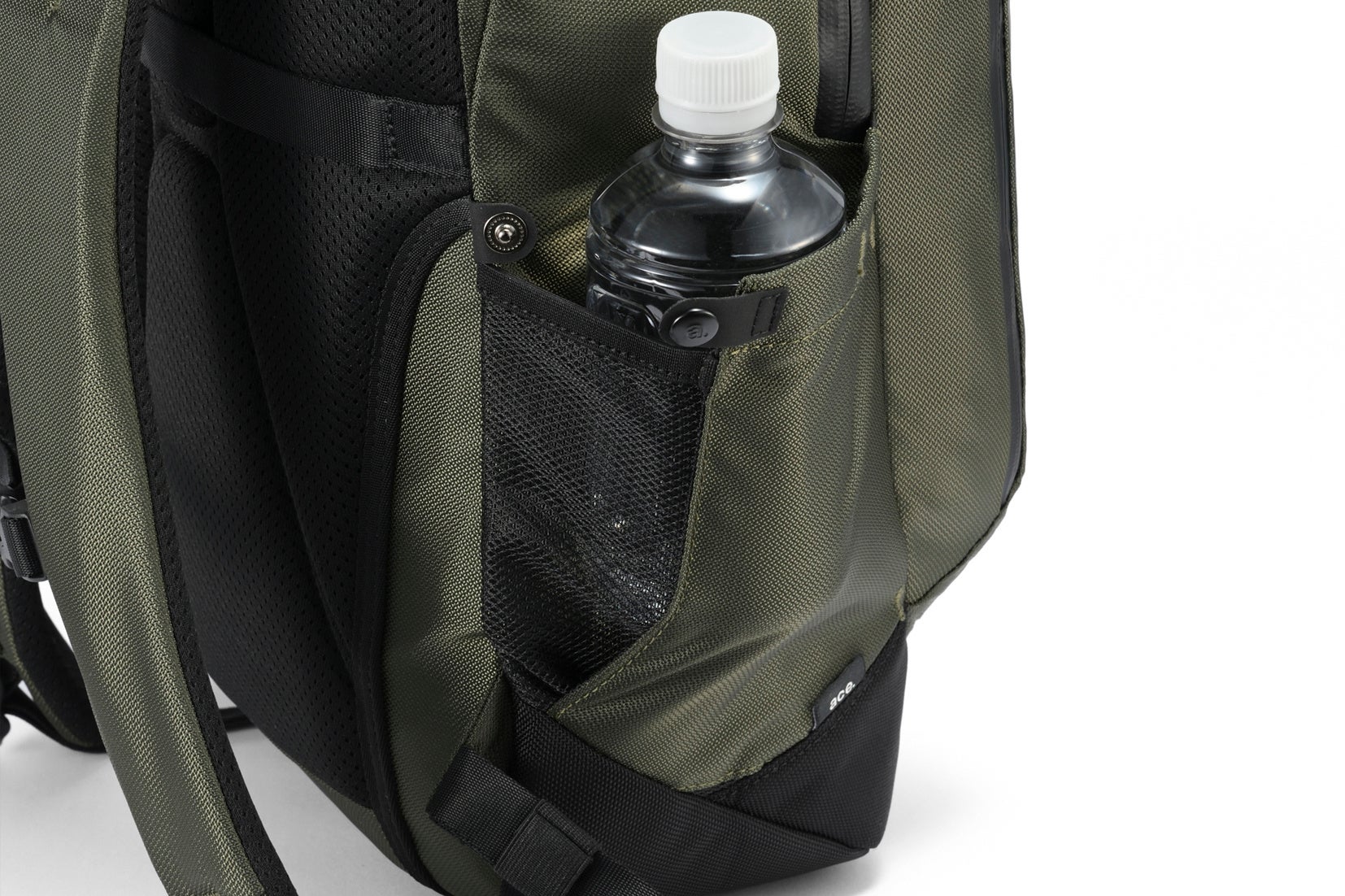 ホックボタンを外すとメッシュ素材のマチが拡がるサイドポケットは、濡れた折り畳み傘やペットボトルを差し込む際に活躍します。
