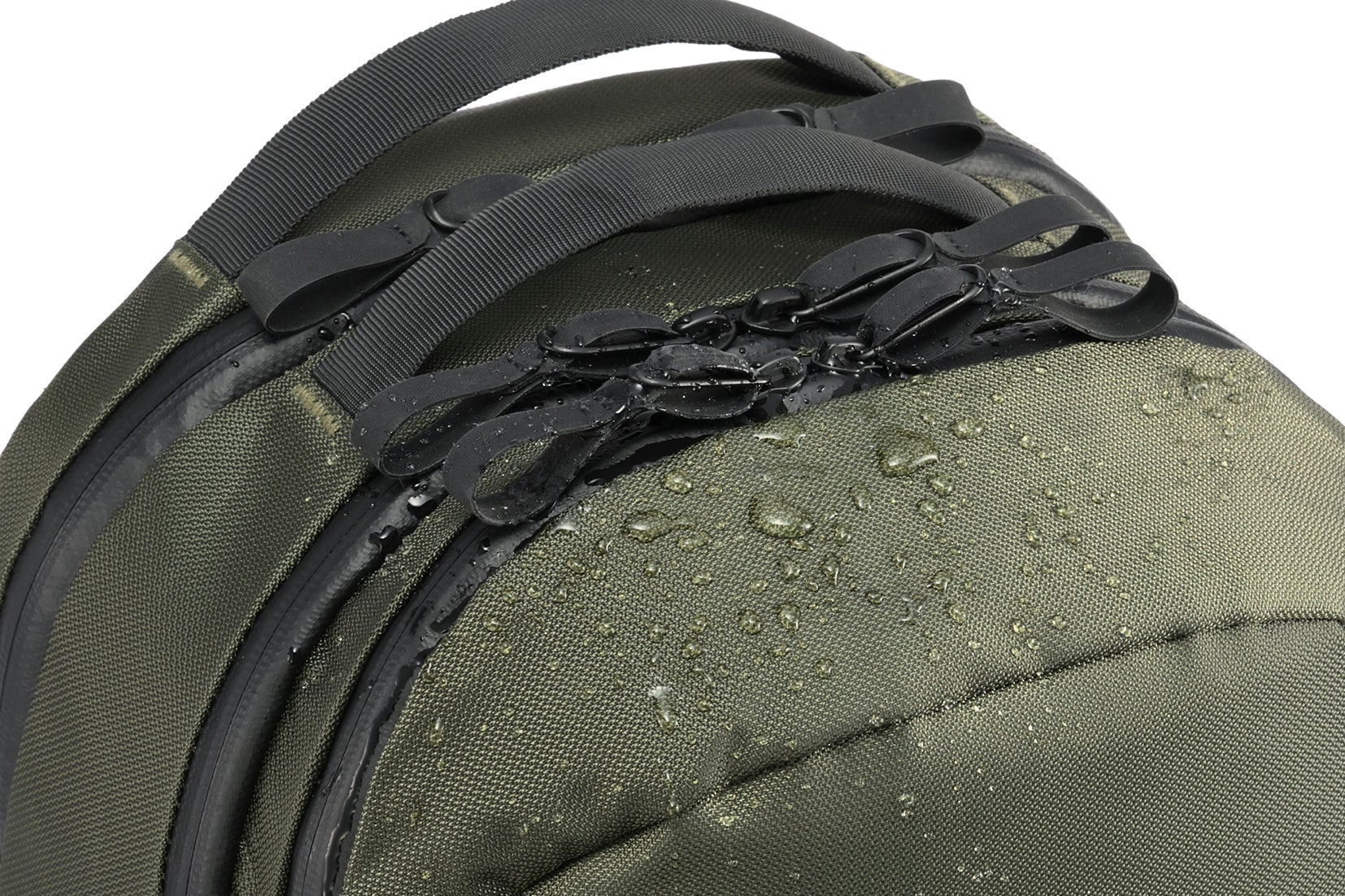耐水性に優れた本体生地と、水が浸入しにくいファスナー