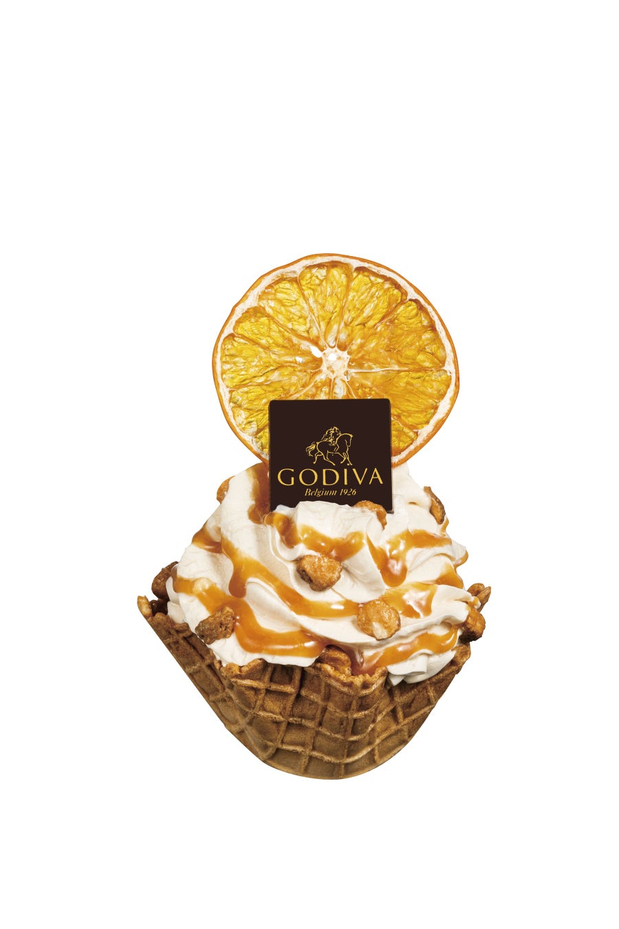 カップにのせたワッフルコーンに、ゴディバ特製のホワイトチョコレートソフトクリームとキャラメルホイップ、ドライオレンジをトッピングしました。冷たいソフトクリームにふわふわのキャラメルホイップがマッチした、ゴディバの新しいソフトクリームです。