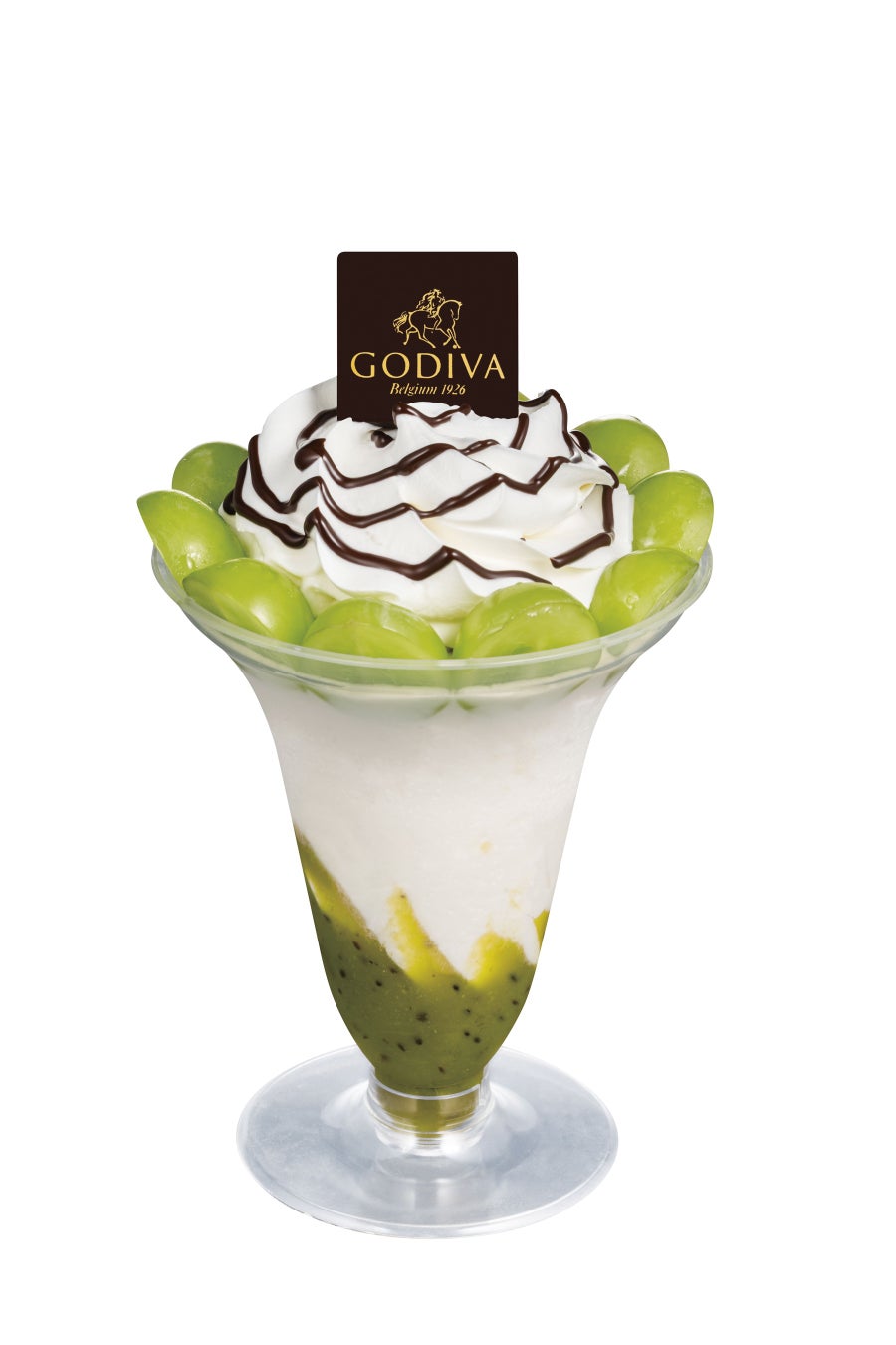 ゴディバ特製のホワイトチョコレートソフトクリームに、シャインマスカットをトッピングしたパフェです。マンゴーとキウイを使用した甘酸っぱいフルーツピューレがアクセントになっています。ソフトクリームの上品な甘みと甘酸っぱいフルーツのコンビネーションを存分にお楽しみいただけます。