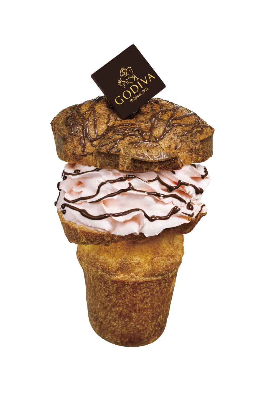 シュー生地の中に、甘酸っぱい苺の果肉とホワイトチョコレートを使用したゴディバの特製ソフトクリームを詰めました。その上に、口どけの良い滑らかな食感の苺ホイップをトッピング。シュー生地とソフトクリーム、苺が三位一体となった新感覚のワンハンドスイーツです。