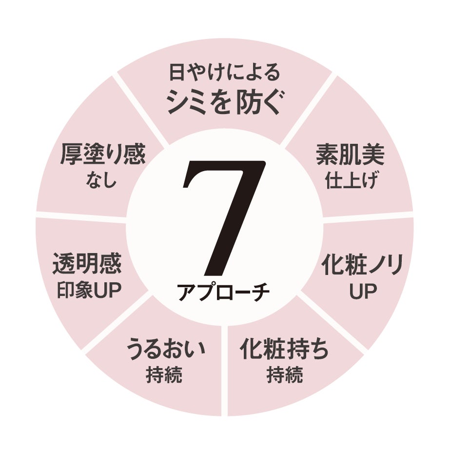 SPF50・PA++++の高いUVカット機能で日やけによるシミ・そばかすを防ぎながら、独自開発の皮脂ハンターパウダーが毛穴の皮脂を吸収しテカりべたつきを抑え、化粧もちを持続させます。また、カプセル化技術によりファンデーションと直接触れにくいよう設計しているので、メイクの上からでもヨレずにキレイに塗り直していただけます。