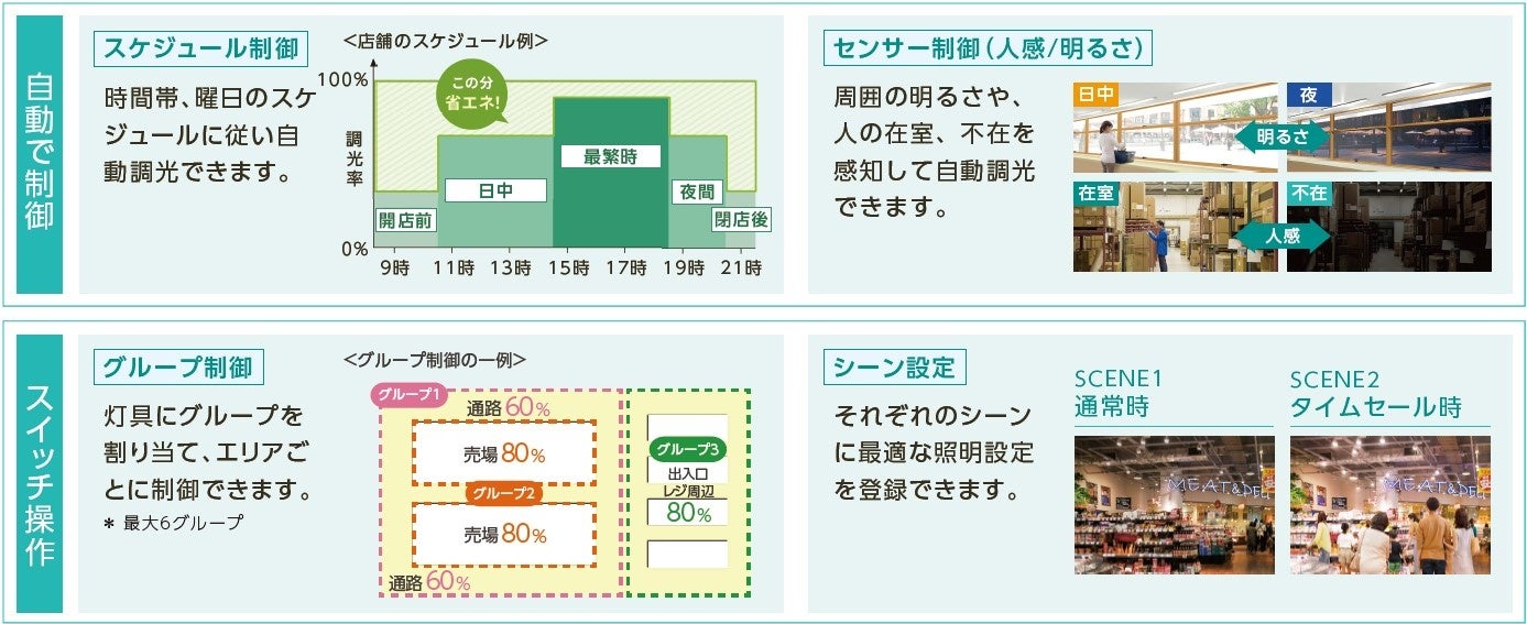 調整可能な項目は時間帯ごとに自動調光する「スケジュール制御」や、周囲の明るさや人の在室を感知して自動調光する「センサー制御」、エリアごとに自動調光する「グループ制御」、各シーンで最適な照明設定を登録できる「シーン設定」などです。