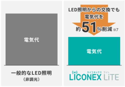 電気代は、「LiCONEX LiTE」対応の照明器具(※3)に交換して照度を最適化することで、古いLED照明の使用時と比較して約51%(※7)の削減が見込めます。これにより、照明に関わるコストを大幅に削減できます。