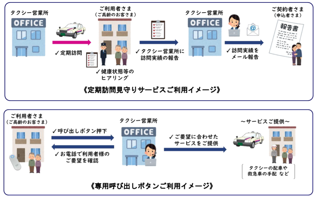 本サービスは、①日頃からタクシーを通院等の移動手段としてご利用いただくことが多いところ、タクシーの乗務員が定期的にご高齢のお客さまのご自宅に訪問し、お話ししながら健康状態やお困りごとなどを伺った上で、伺った内容を離れて暮らすご家族にメールで報告するものです。ご高齢のお客さまと離れて暮らすご家族が、コロナ禍等で直接会うことができない中、体調を気遣うニーズにお応えし、離れて暮らすご家族同士が安心して暮らせるようなお手伝いをします。