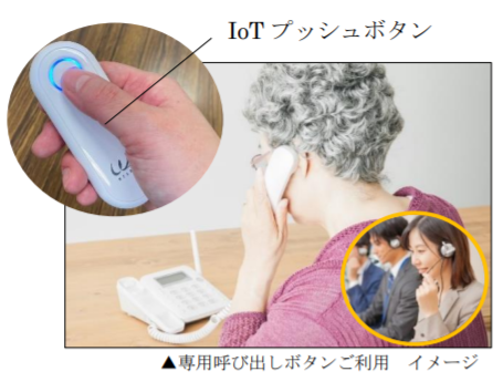 また、②本サービスをご利用いただくご高齢のお客さまのお宅には、IoTプッシュボタンの「専用呼び出しボタン」を配布します。通常のタクシー配車依頼のほか、病院への付き添いやお買い物代行、体調不良時における救急車の手配など様々な場面で呼び出しボタンをご利用いただくことで、日常のお困りごとの解消につなげてまいります。