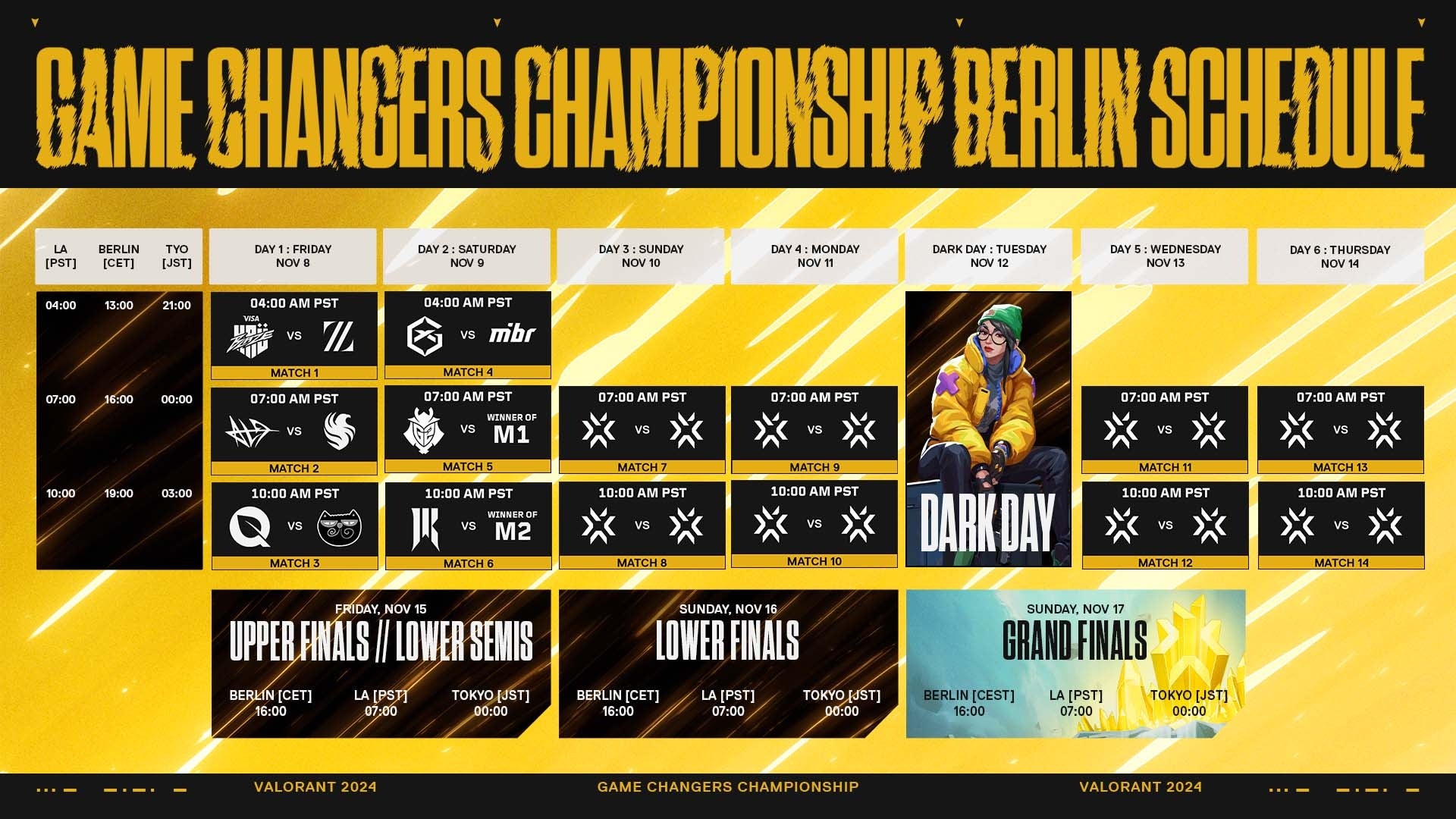2024 Game Changers Championshipはダブルエリミネーション形式で行われ、最初のラウンドはBO3形式で戦われます。国際大会ならではの多様な組み合わせを実現するため、同じ地域のチーム同士はブラケットの逆側に配置されます。トーナメントが最高潮を迎えるのは、土曜日のBO5形式のロワーファイナル、そして王者となるチームが決定するBO5形式のグランドファイナルです。