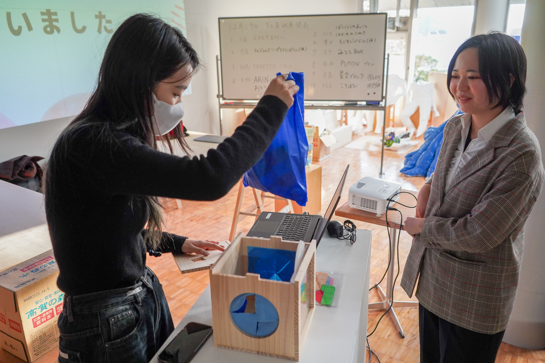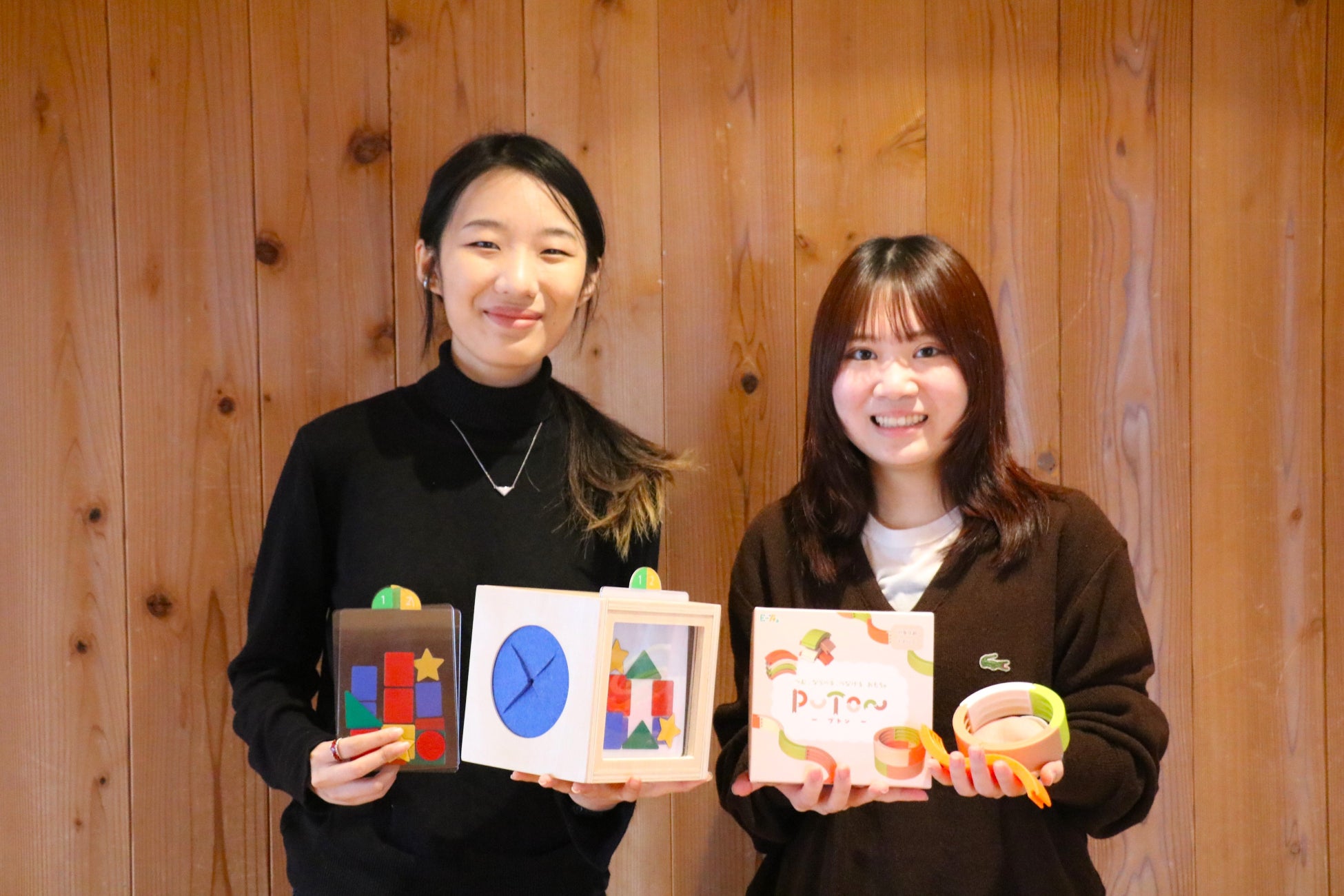 このたび、初年度のプロジェクトの成果として、オーソドックスな型はめ遊びはもちろん、目隠し状態での積み木遊びもできる「みててBOX」、“つむ、ならべる、つなげる”などの指先の動きで集中力や空間認知力を育む「PUTON(プトン)」の2点が商品化の運びとなりました。