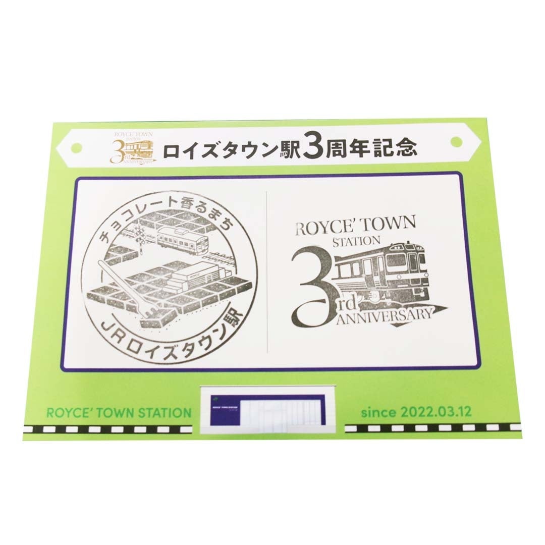 ロイズタウン駅3周年記念デザインのスタンプが新たに登場!通常のデザインのスタンプと、記念台紙もご用意しています。記念に押してお持ち帰りください。