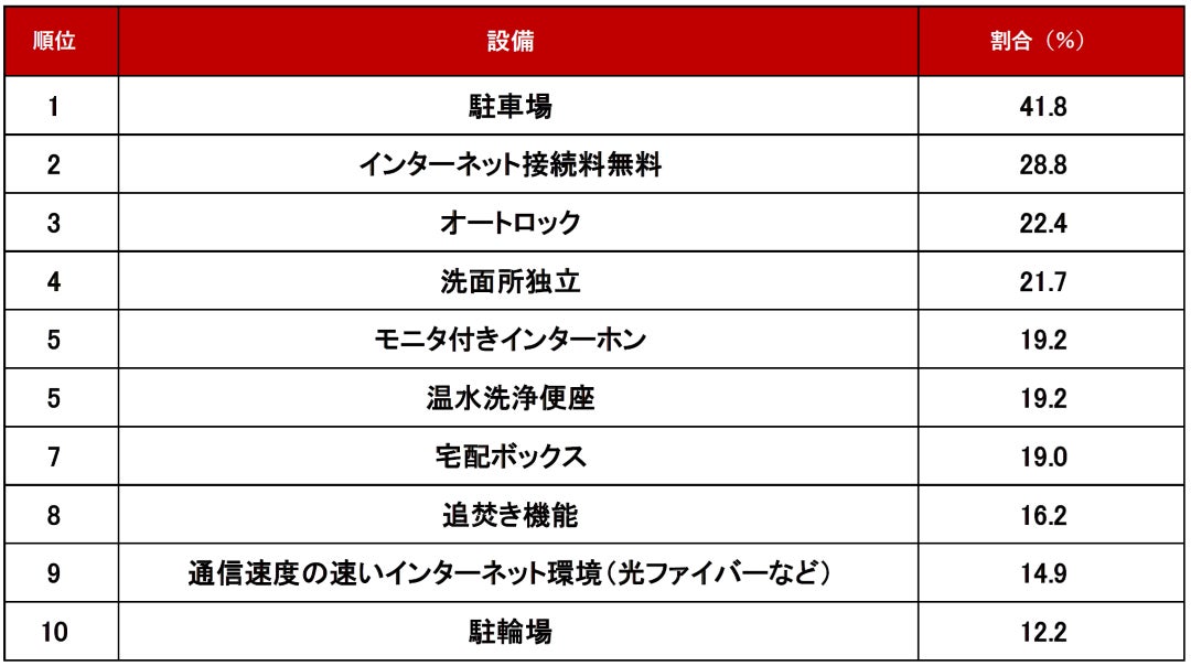 設備編の1位は「駐車場」でした。不動産会社からは、「複数台車両を所有するお客さまが多く、物件探しの第一条件が駐車場の空きである場合が多い」「来客用にも駐車場が欲しいというお客さまがいた」というコメントが見られました。