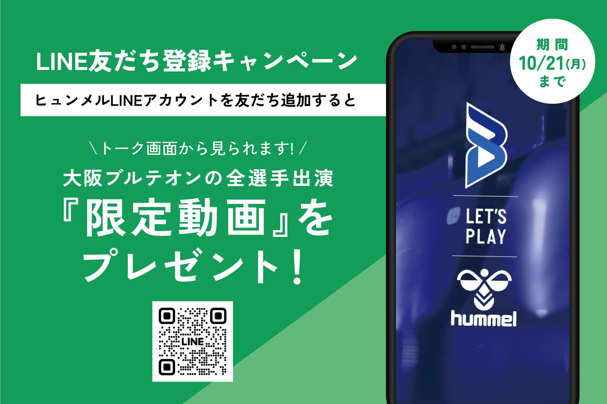 さらに、入場者全員に『大阪ブルテオン&hummel』特製パンフレットを配布し、「LINE友だち登録キャンペーン」を実施。ヒュンメル公式LINEに友だち登録すると、大阪ブルテオン全選手が出演した限定動画をプレゼントします。パンフレットは、翌10月20日のGAME2でも配布します。